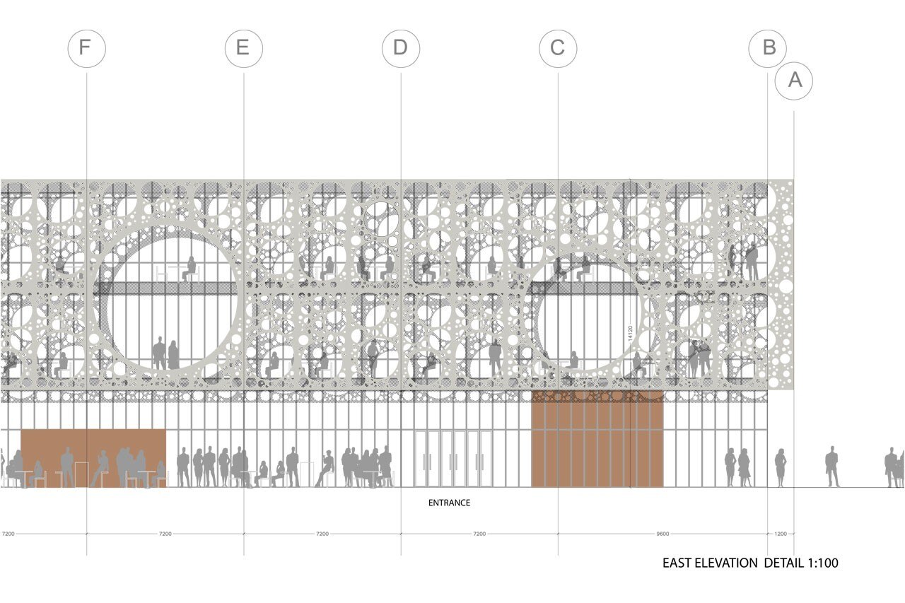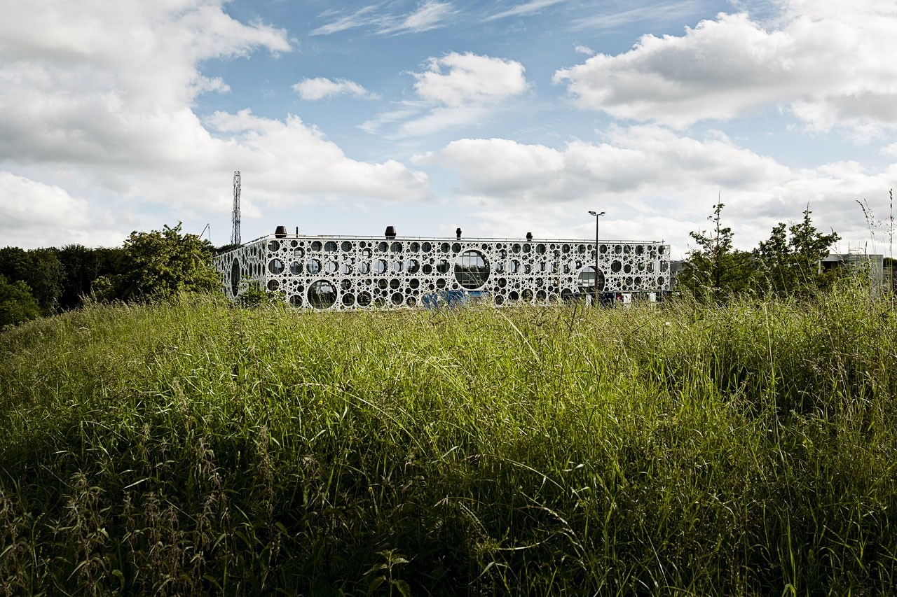 The building is designed as a glass house with an external screen or veil revealing and shading the glazing. The elegant and seemingly weightless screen is made from pre-fab panels of white CRC concrete (Compact Reinforced Composite, a special type of Fibre Reinforced High Performance Concrete with high strength) featuring circular openings with an underlying solar screen and natural ventilation.