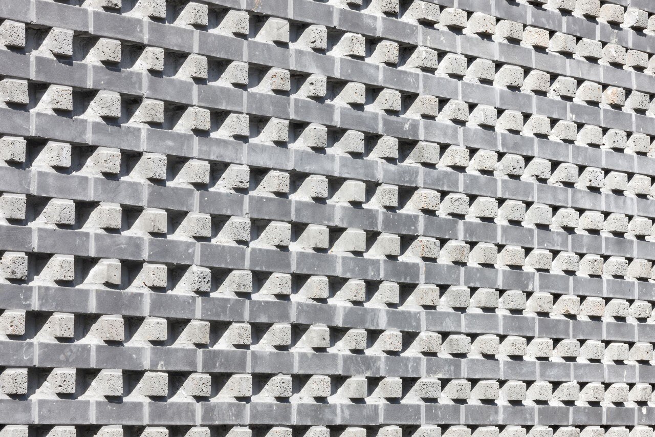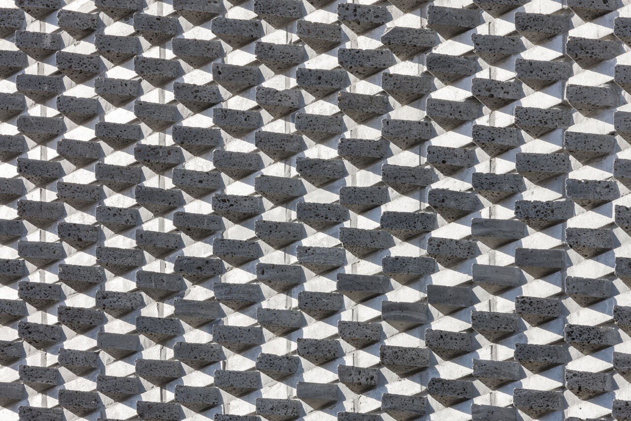 This project is focusing on contracting the features of basalt including its rough pores and its surface that is different from a fired brick. The architectural form consists of basalt bricks, general brick, and stainless steel. As well as general brick, about 20,000 basalt bricks, which are the main material to compose the rough surface, are divided into two parts according to their angles and recomposed on the architectural form. The basalt bricks are allocated horizontally in five parts ranging from 5 degrees to 45 degrees. The changes are caused from the features of the bricks as the material presents the changes of strata in contrast.