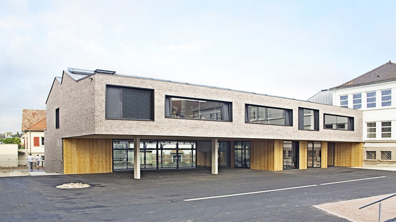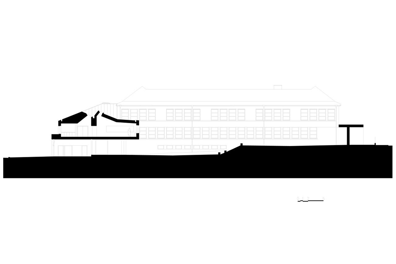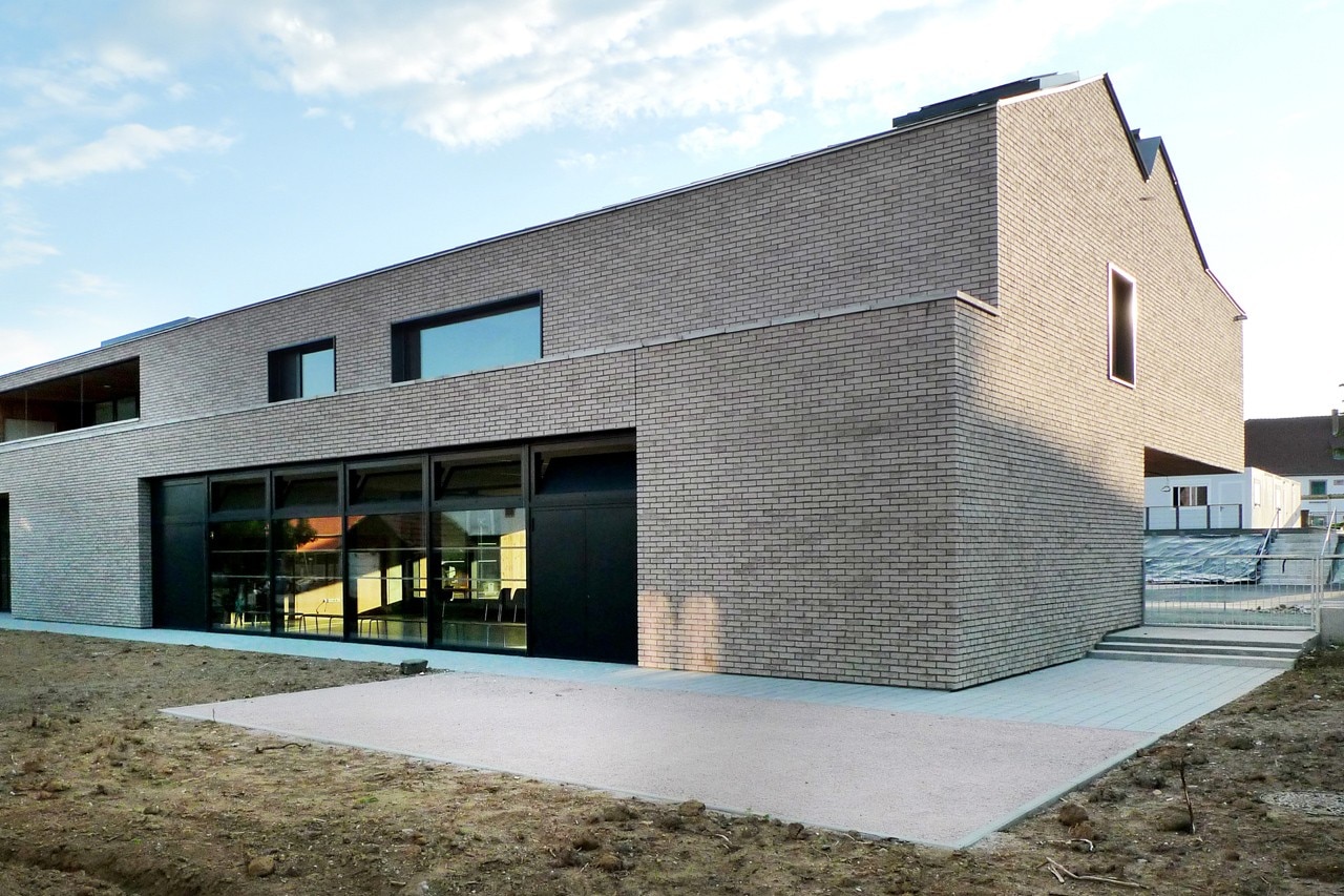 All the classrooms are located in the upper levels as a cantilever over the cover yard. Inside as outside, the project is defined by a relationship between noble and raw materials: concrete, natural wood elements, woodfiber ceiling panels for inside, handmade bricks, wood panels and matt lacquered aluminium for the facades and natural zinc for the rooffing.