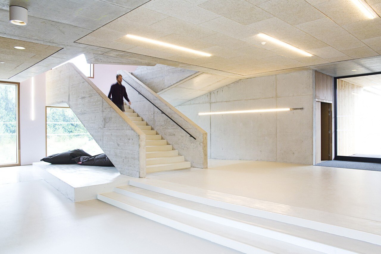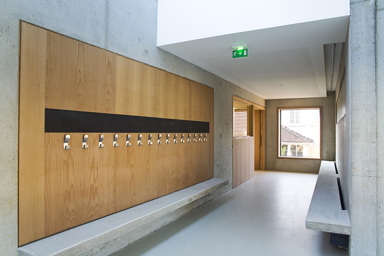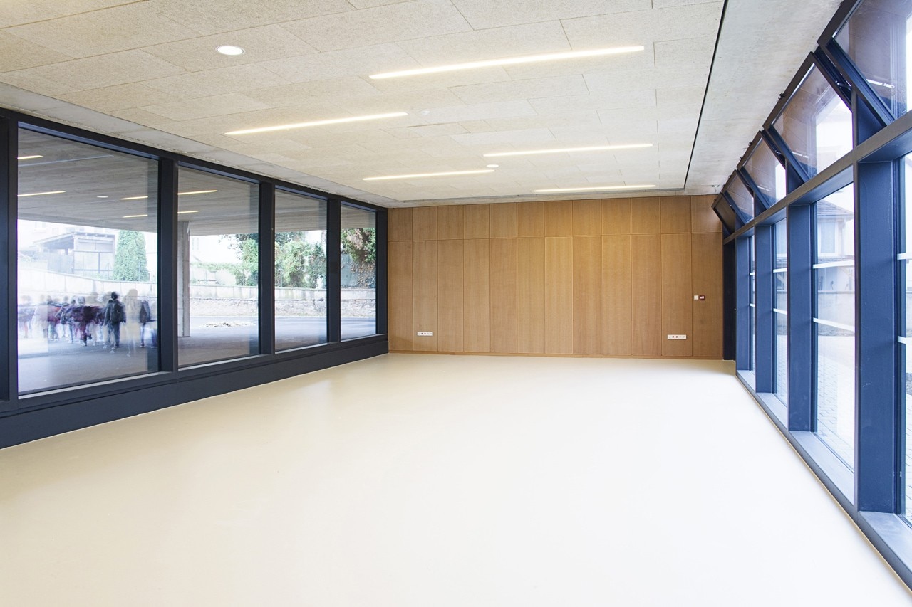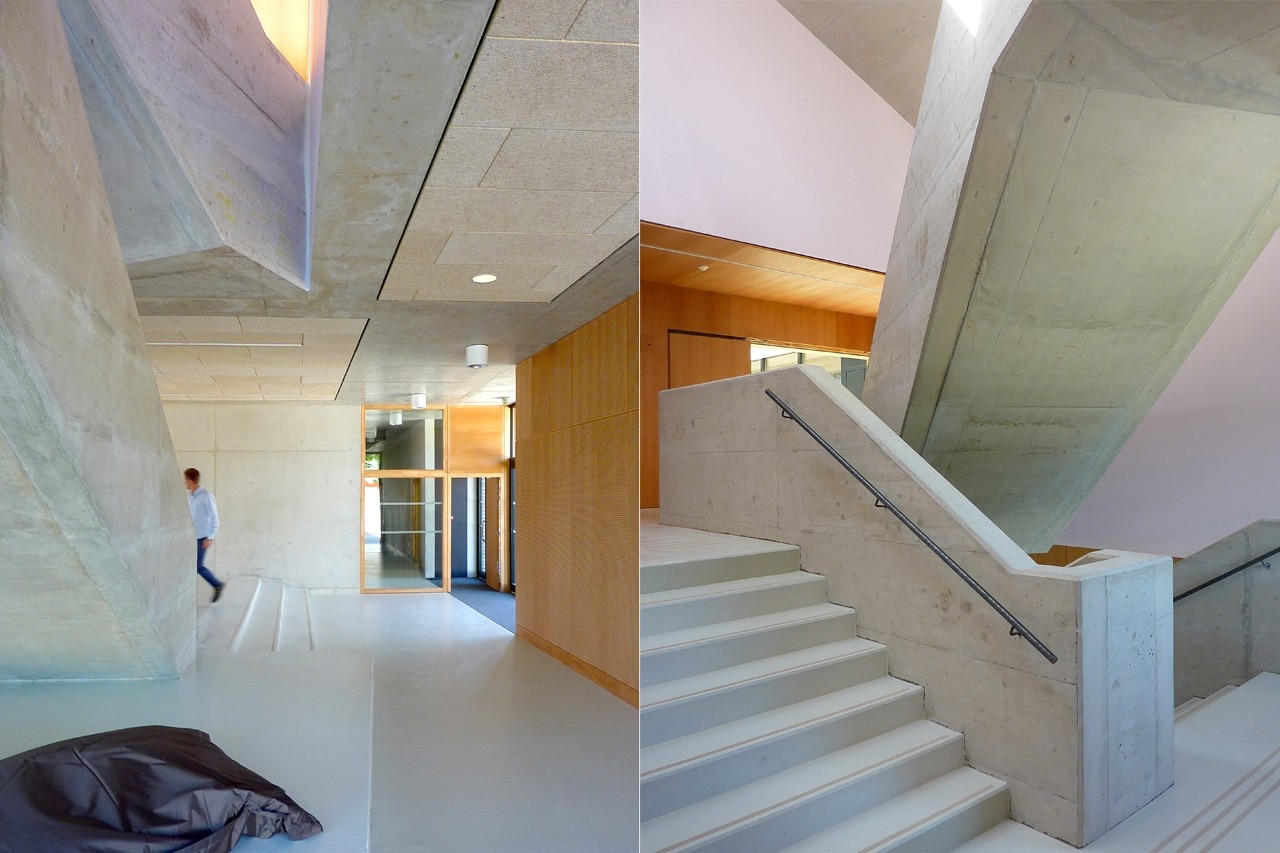 The wide see-through entrance hall welcomes a monolithic concrete stair to reach all the levels of both the new and existing buildings. On the ground floor, the children have access to the shared part of the school: the multi-functional hall and the computer room.