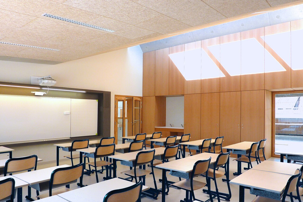 Two wide 30-meter-long skylight windows on the roof bring a very big amount of natural light into the building. It is also an easy way to ventilate naturaly the classrooms during the summer.