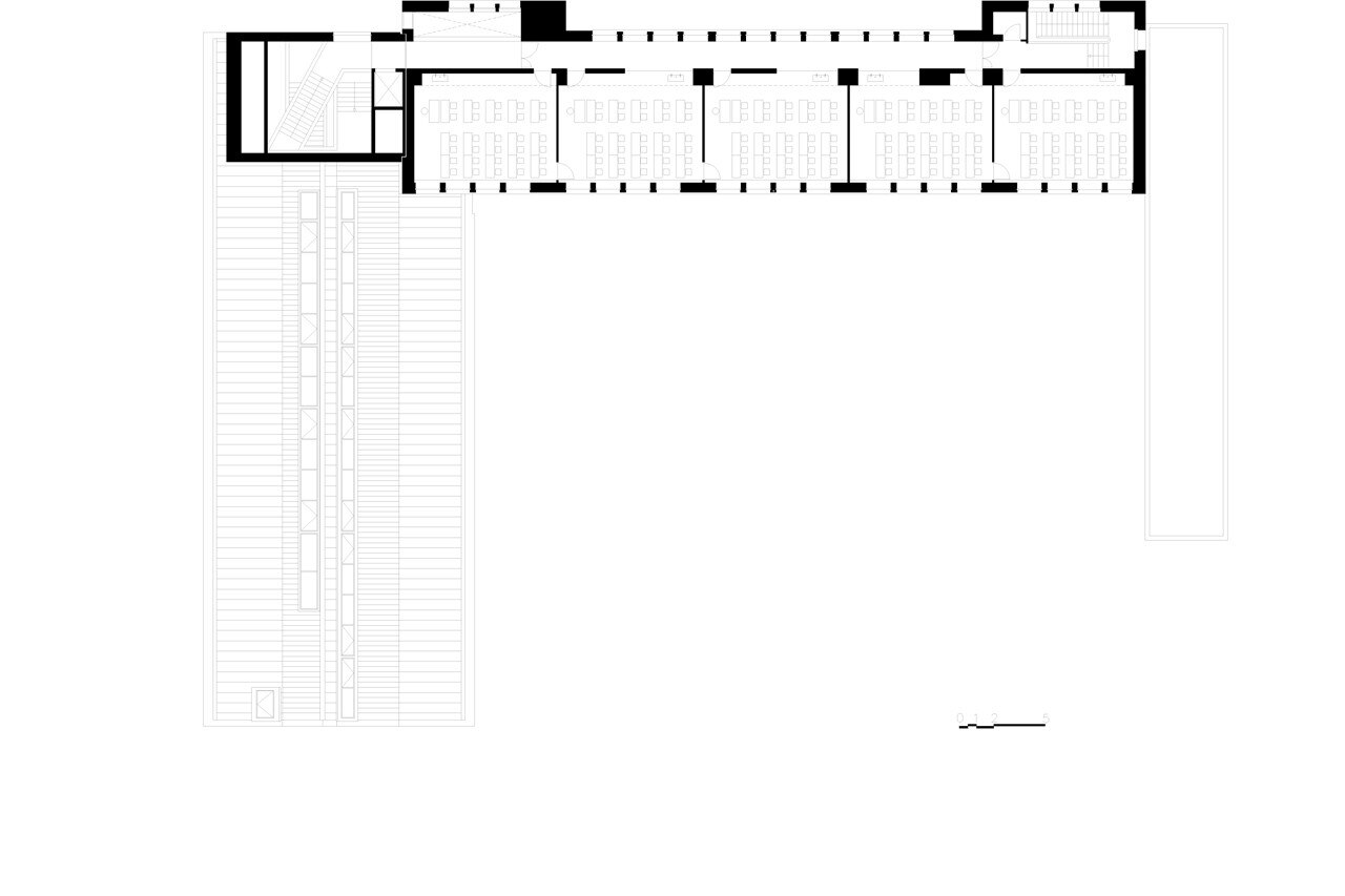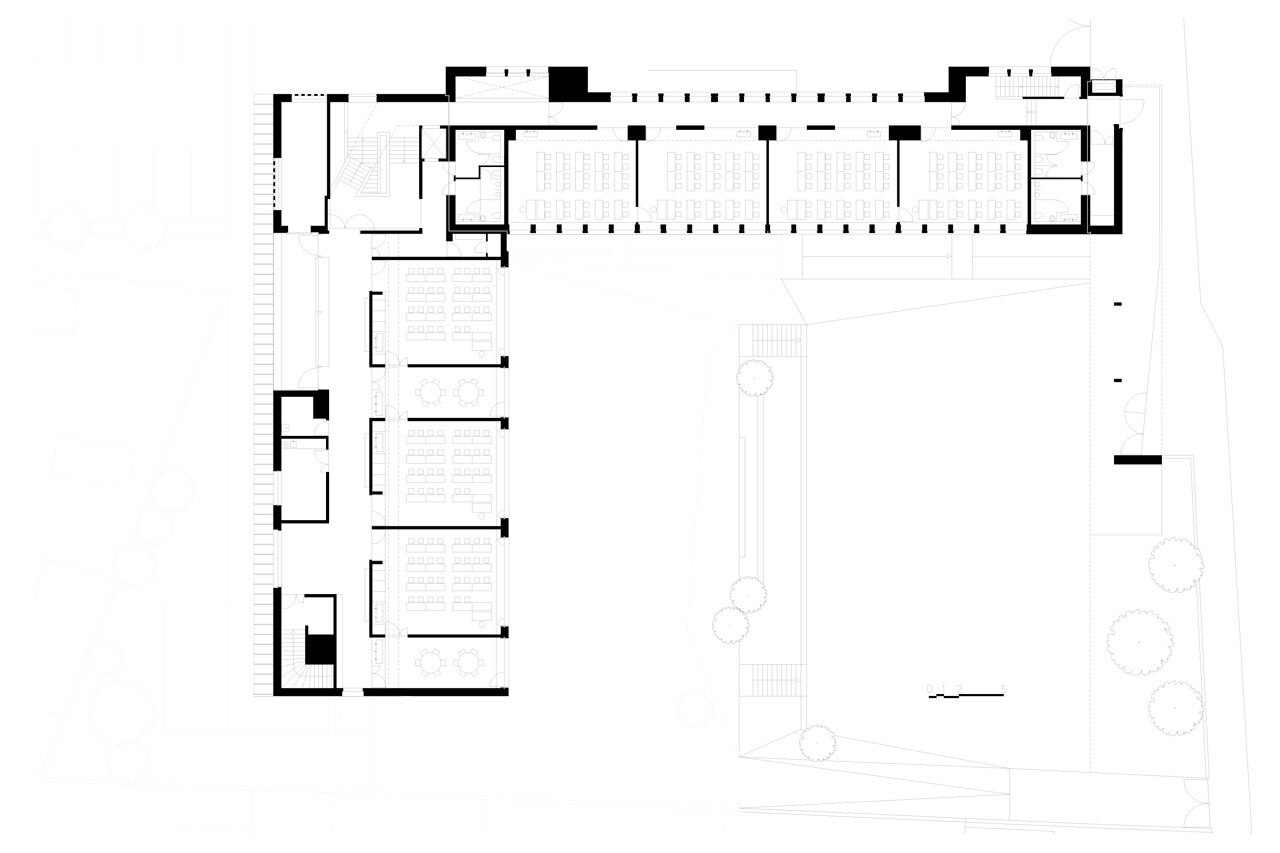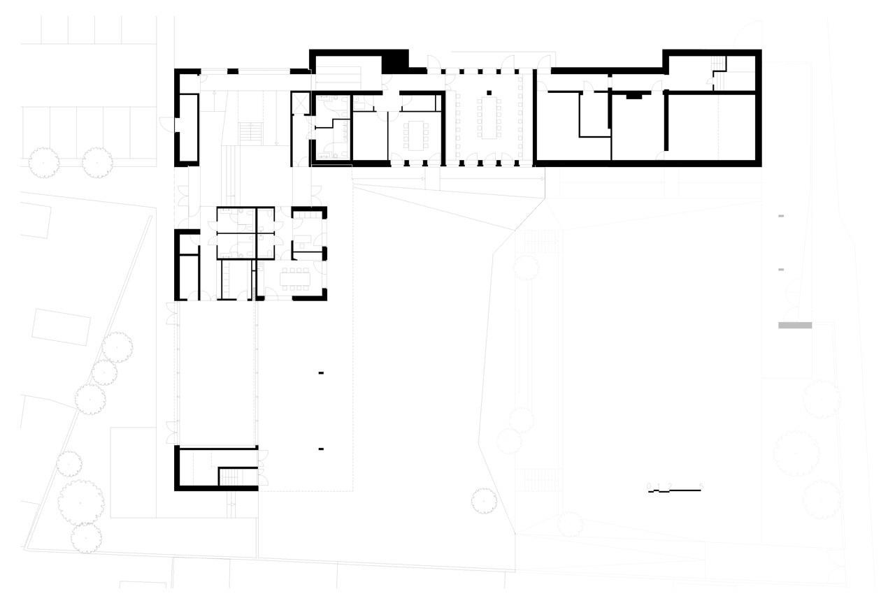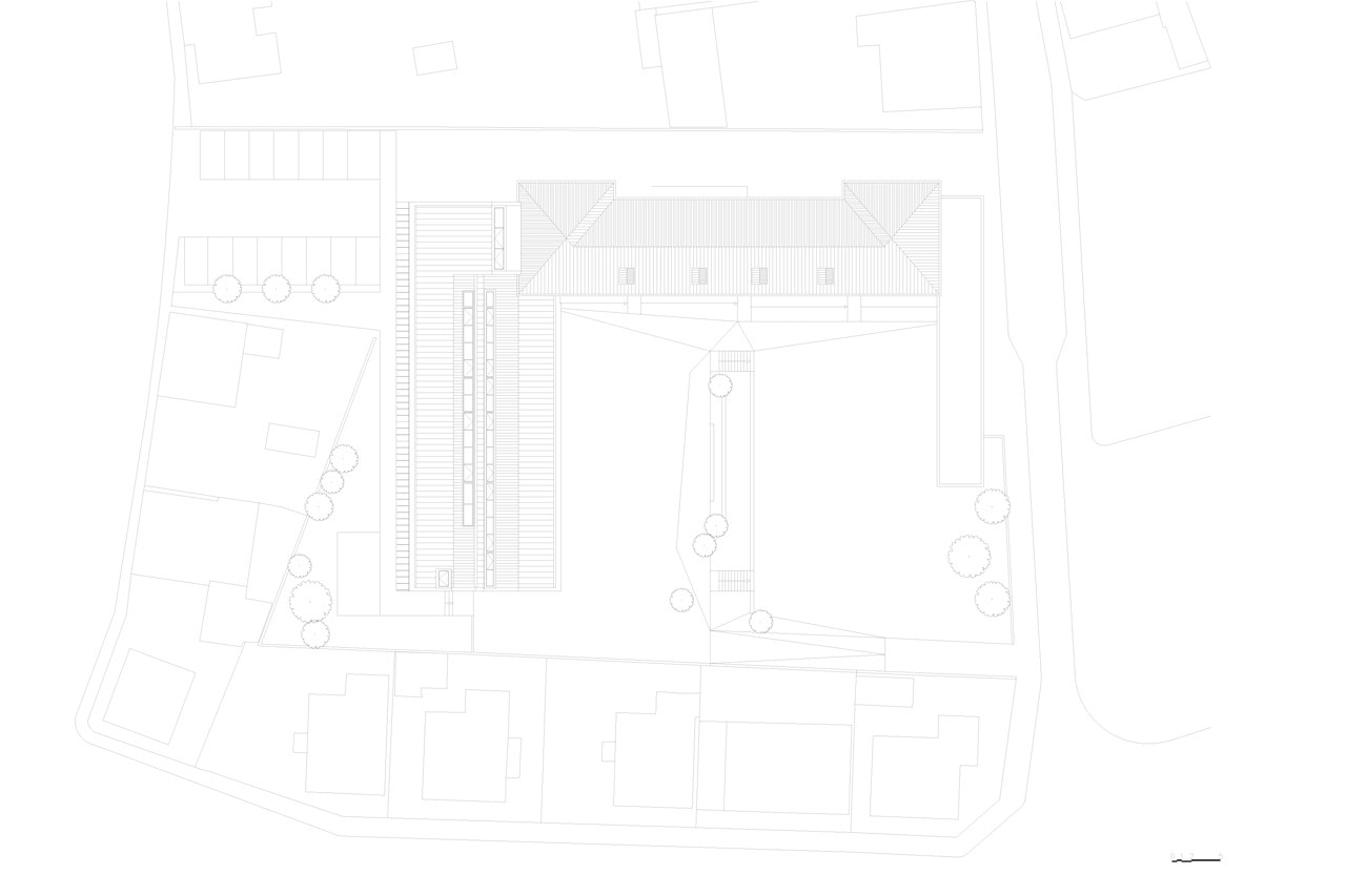 The new building is connected to the existing one on its edge offering the entrance hall to be at the crossroads of every people flow and creating a link between the market place at the East and the gardens on the opposite side.