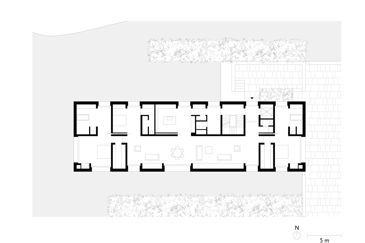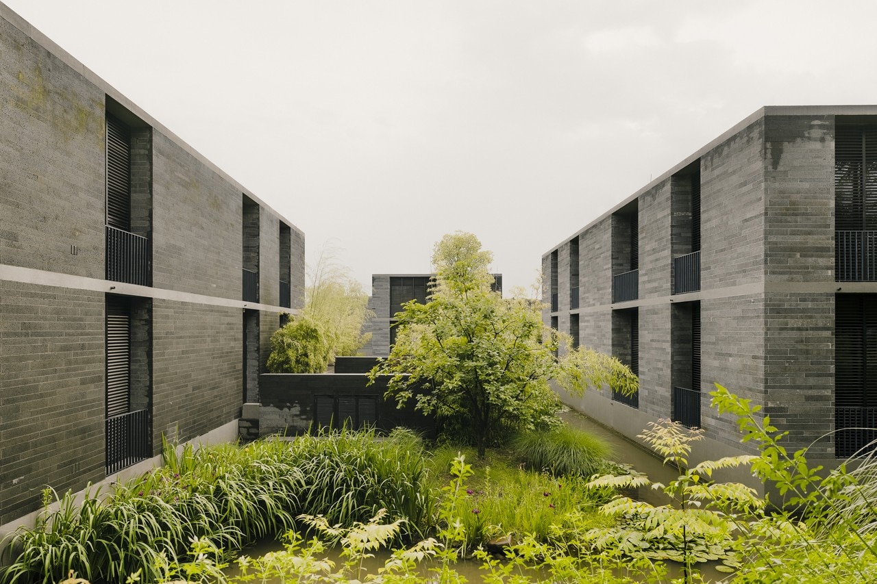 The apartment buildings are surrounded by a water garden, which, as a reference to the wetland park, is a mostly wild landscape. In contrast to these green surroundings, the buildings appear as dark stone volumes embedded in the water garden. They are, as is typical for villages in Xixi, placed on a stone plinth that sits in the water.