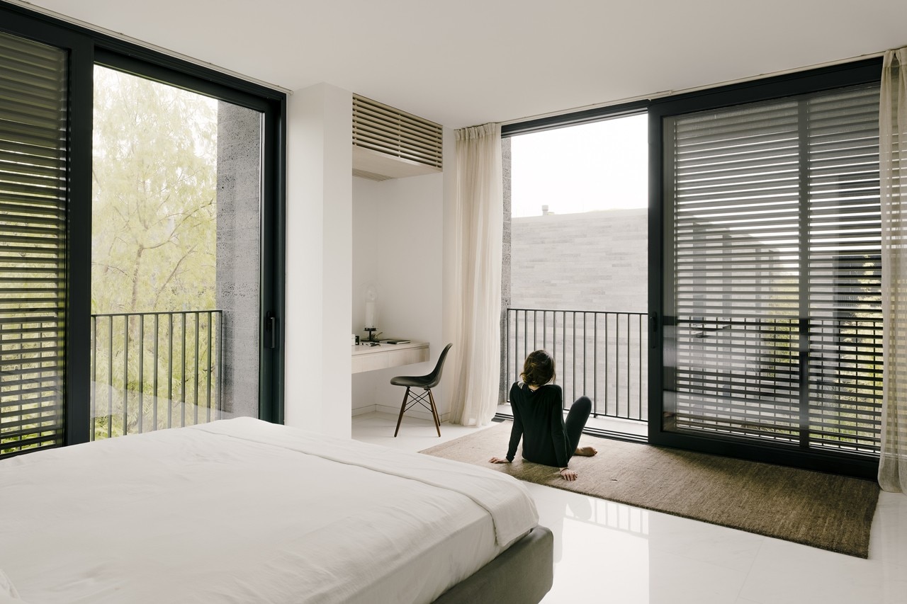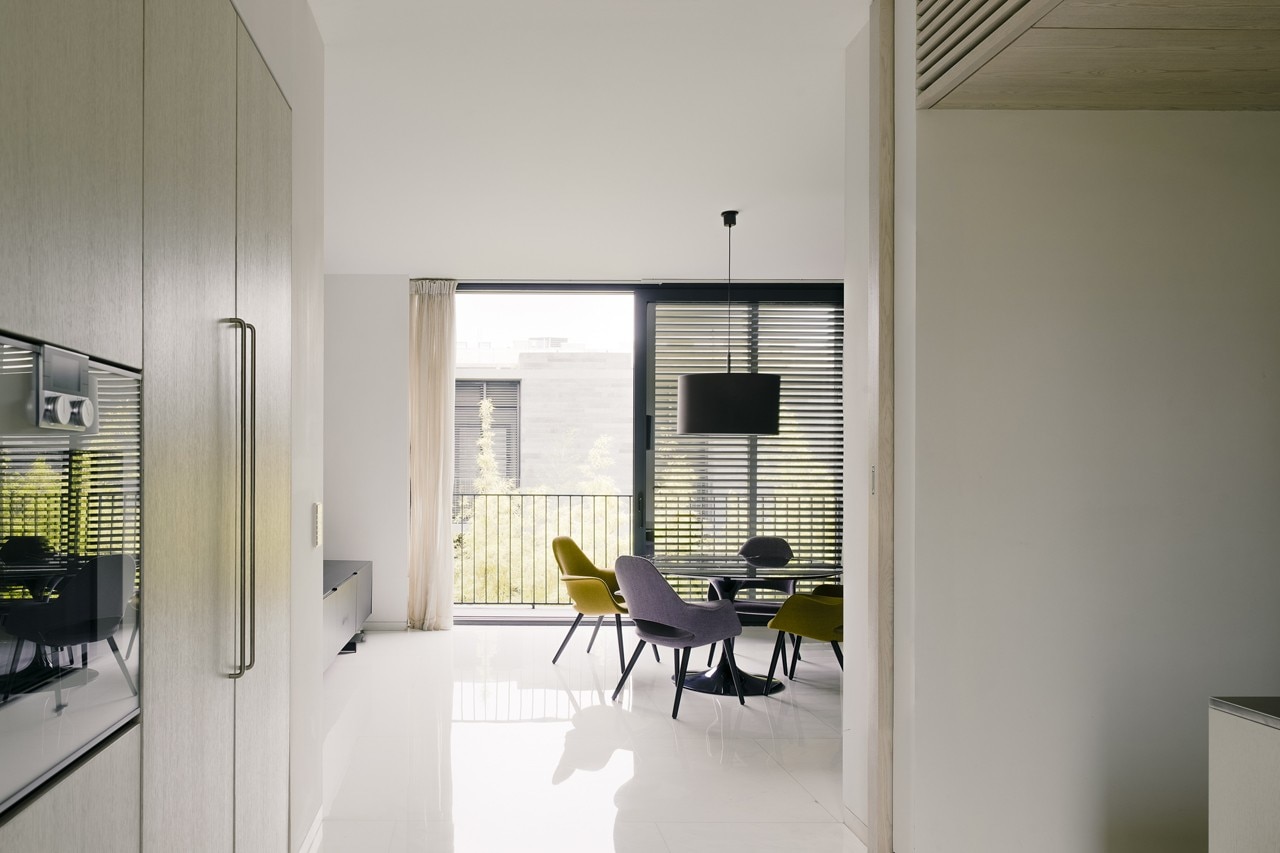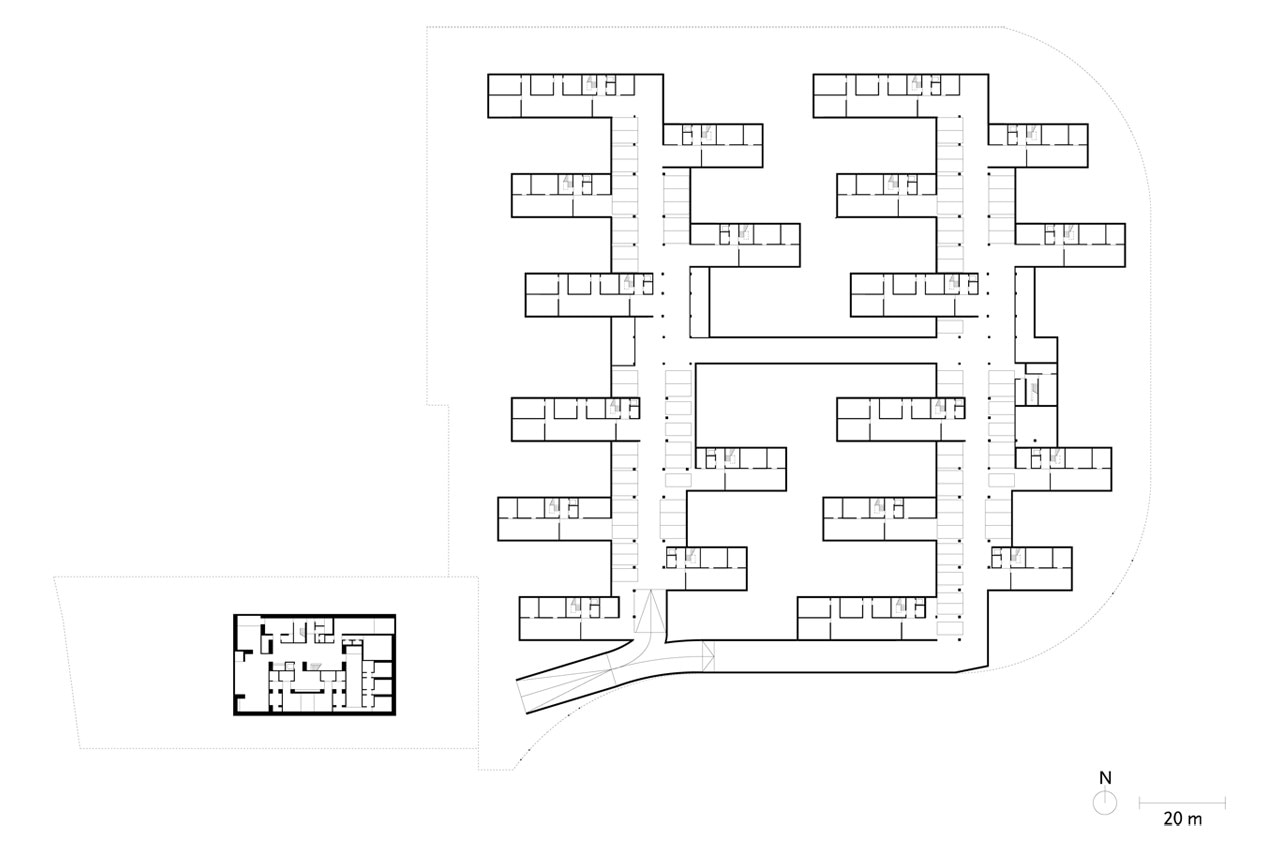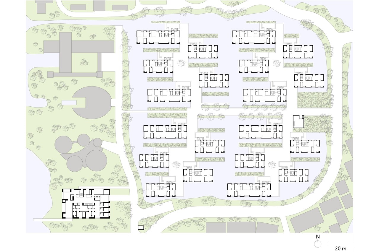 This plinth forms the base of a village group with various levels, walls, and balustrades creating a sequence of exterior spaces, which enable access to the buildings. The interiors are characterised by floating spaces. Room height windows allow for natural light and views over the water garden.