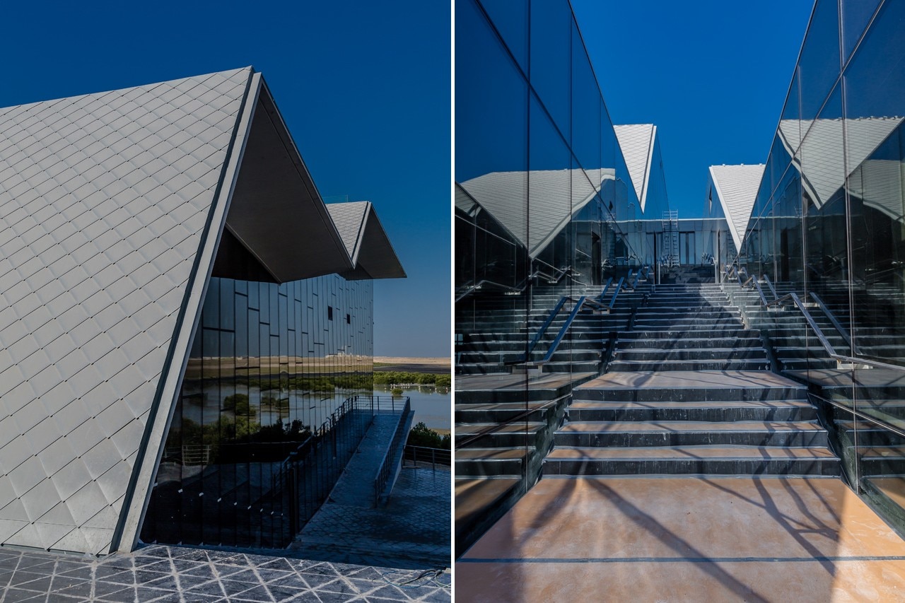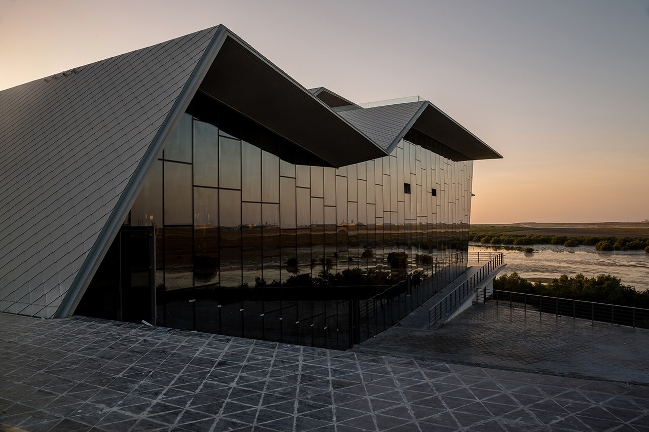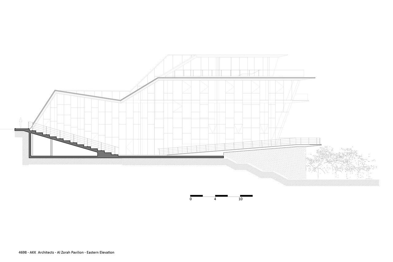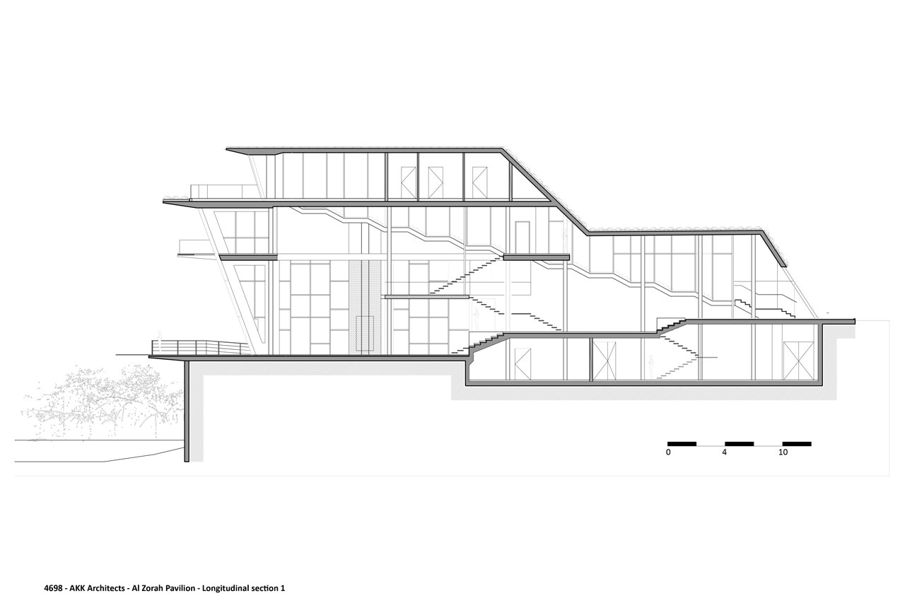Spaces open up from under a folded crossed cut slab: the slope of the folded roof starts from the entrance and reaches up to the highest point of the structure through an open air staircase which leads to terraced belvedere spaces looking out to the sea; it beckons visitors to climb it to survey the rooftop views. The entrance is at the cut between the roofscape and has a well-framed view out towards the natural mangrove. The pavilion extends with a walkway that takes visitors on a stroll into the landscape; the building is a balcony looking out towards Al Zorah’s mangroves.