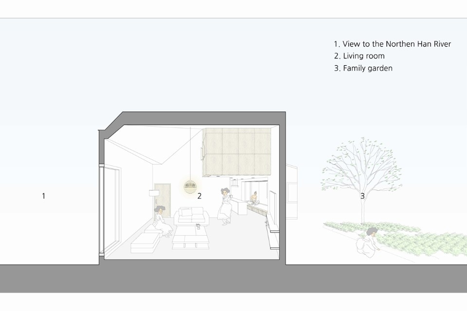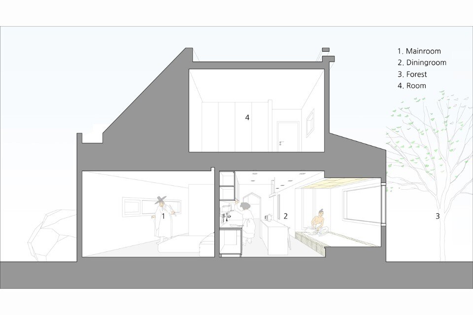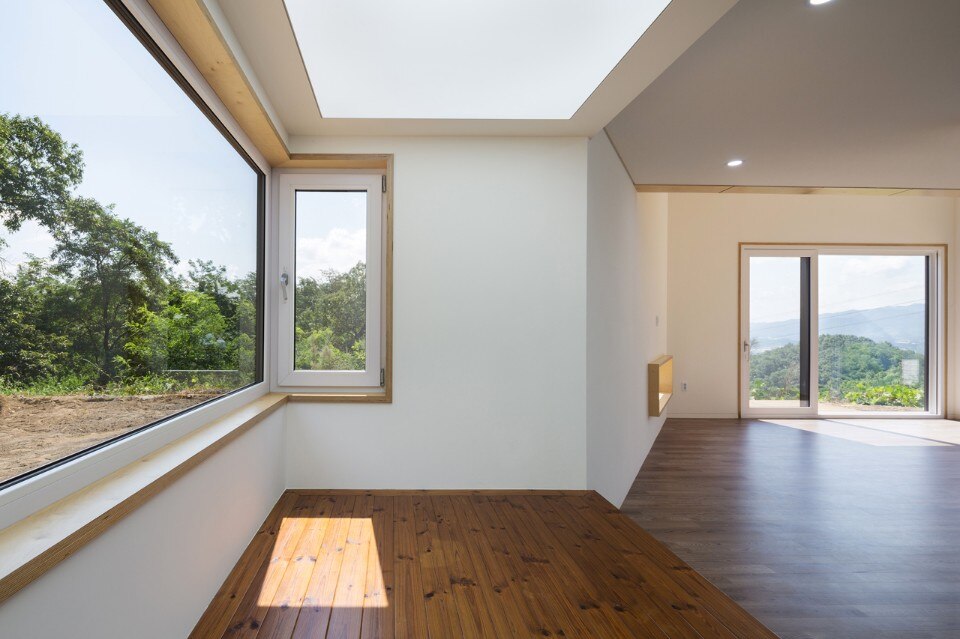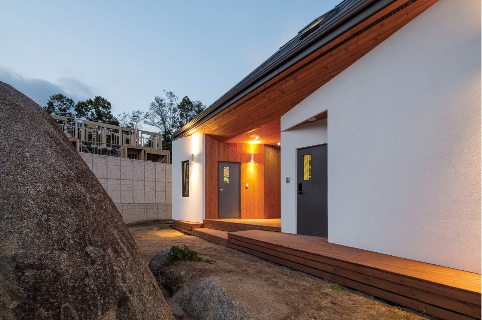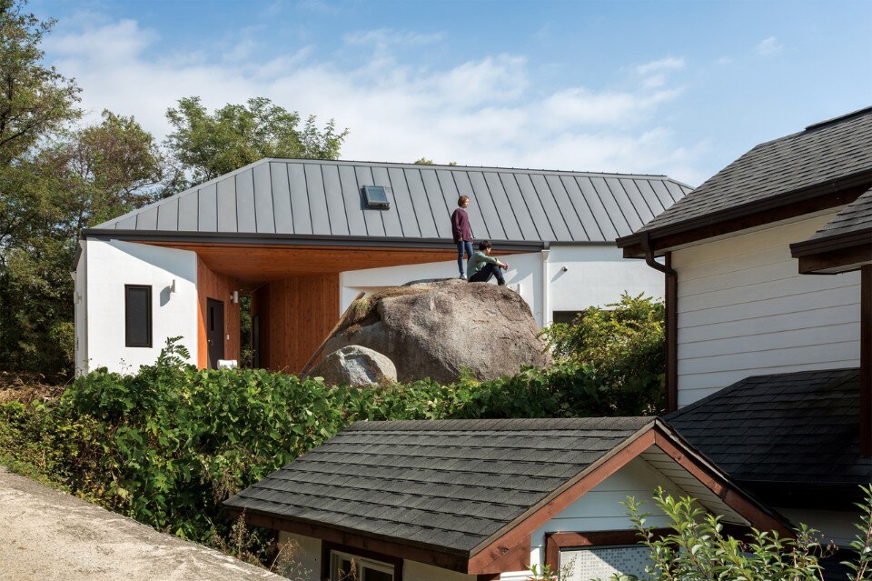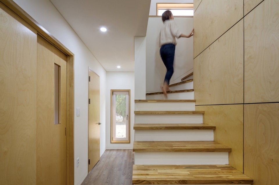 B.U.S Architecture left intact the great rock existing on the ground. Putting the house at the center of the site and creating a circulation inside the house enabled sequence from the rock through the forest at the backyard to the living room where one can see the Northern Han River. In this experience, one comes to encounter three yards with different characters and can enjoy so long and variegated landscape.