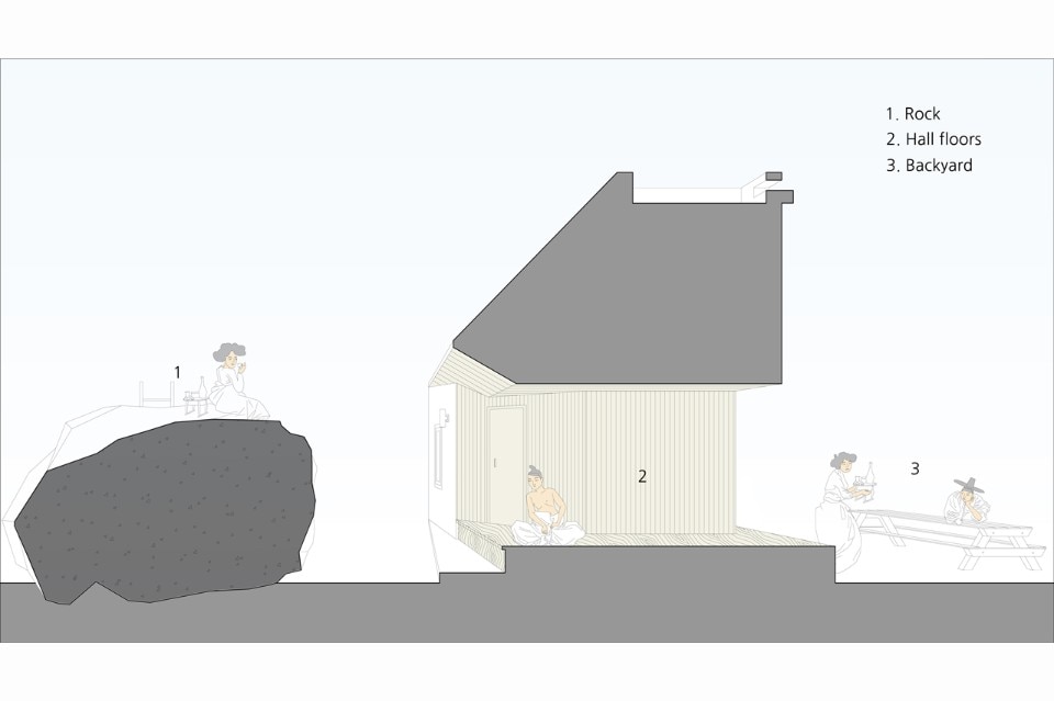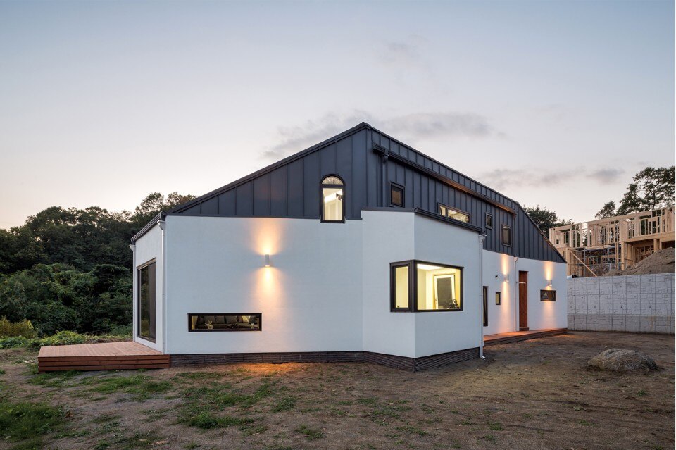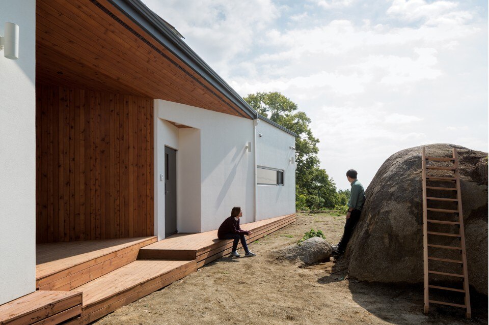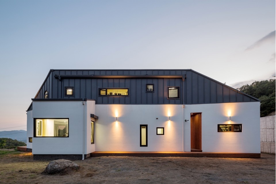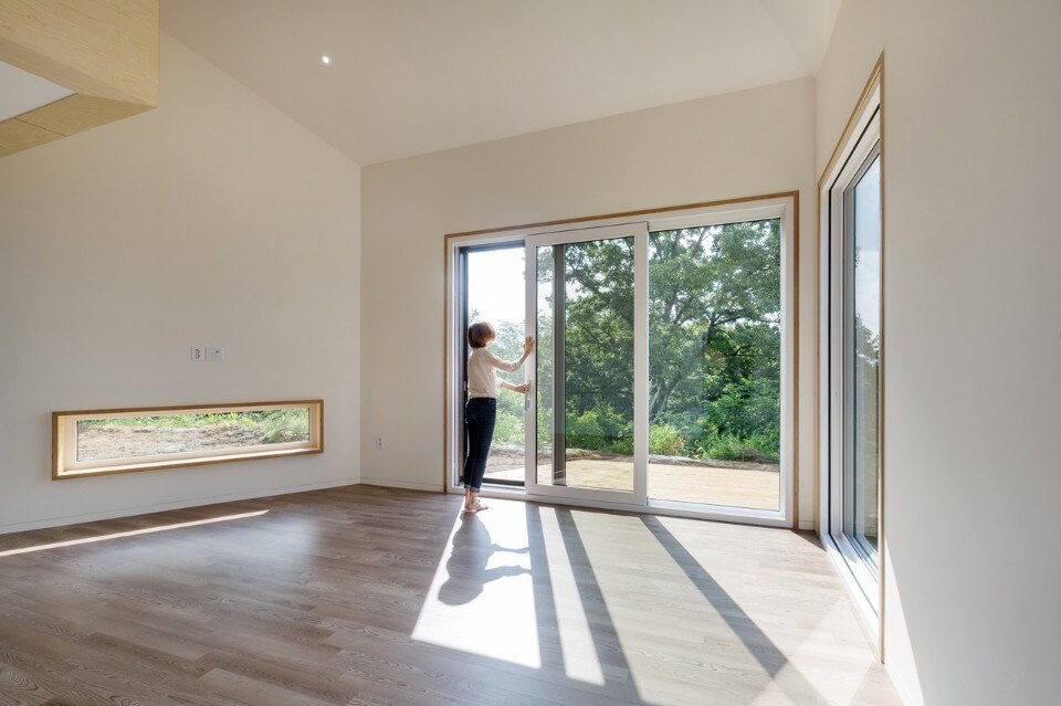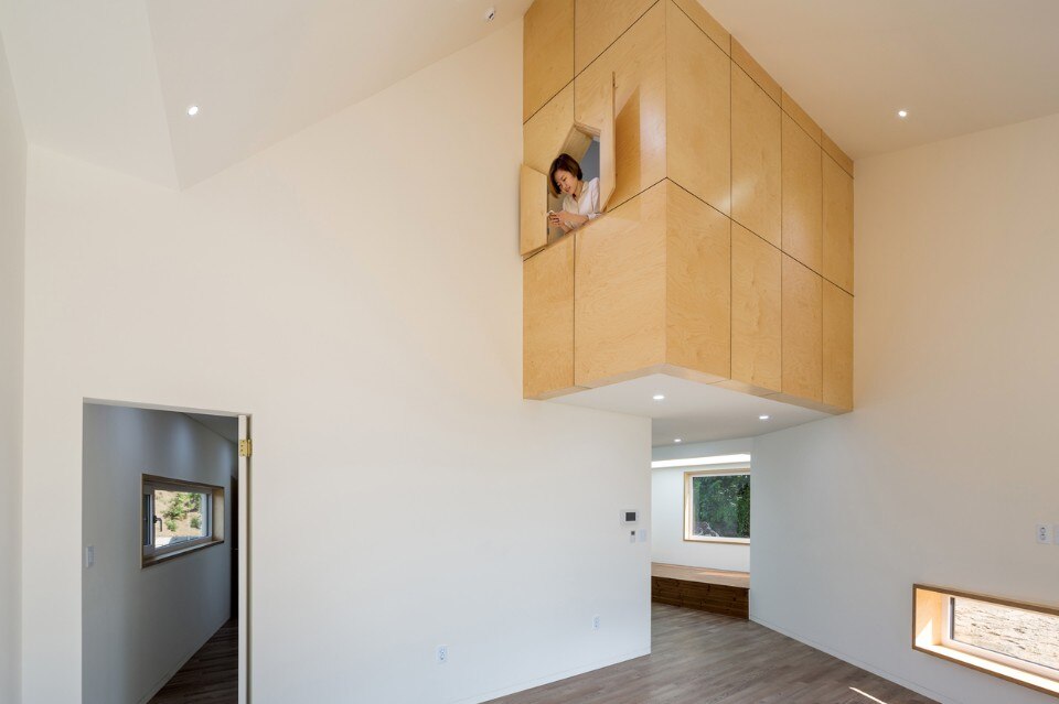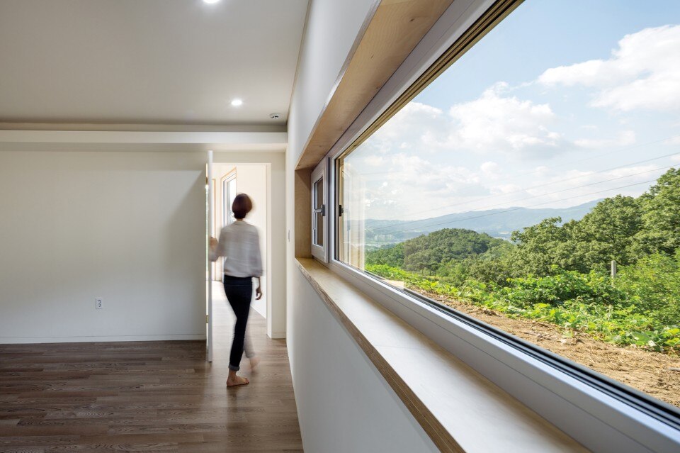 B.U.S Architecture left intact the great rock existing on the ground. Putting the house at the center of the site and creating a circulation inside the house enabled sequence from the rock through the forest at the backyard to the living room where one can see the Northern Han River. In this experience, one comes to encounter three yards with different characters and can enjoy so long and variegated landscape.