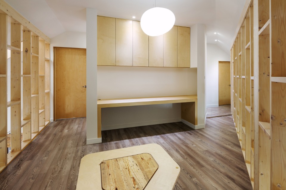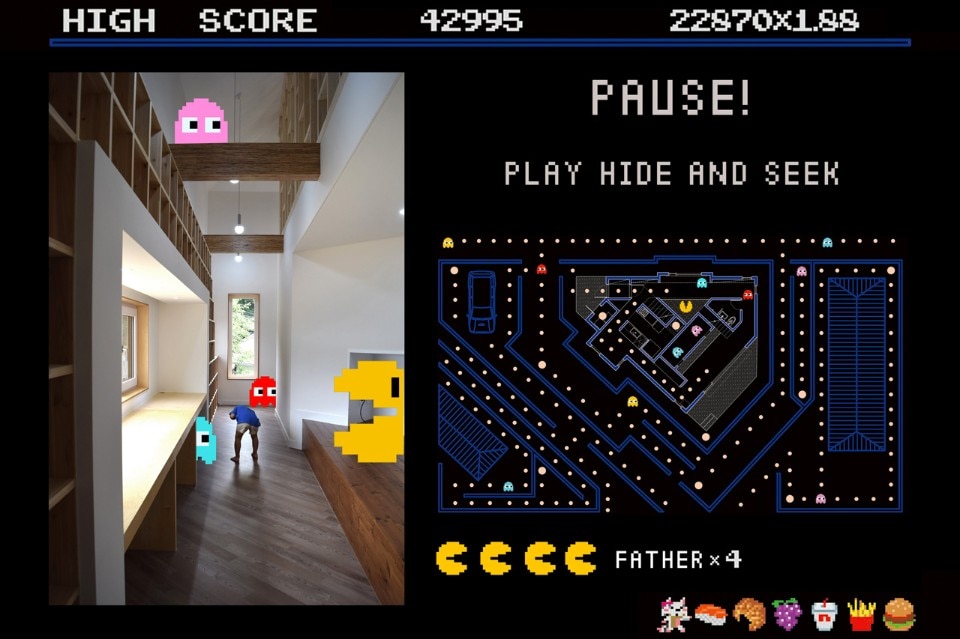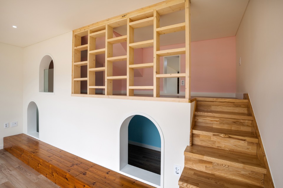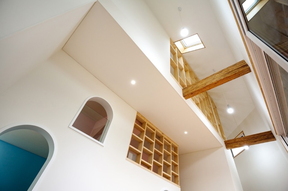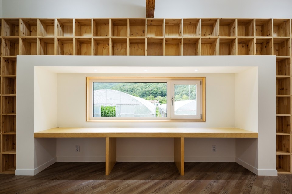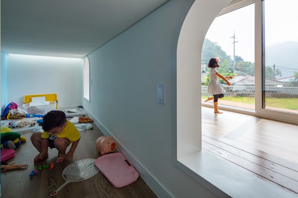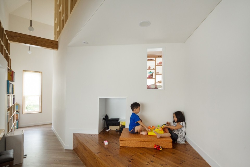 Frolicking freely along this path which flows from outside in or from inside out, the children come to experience a more variegated space. Opening the front door and coming inside, one can encounter the bookshelves along the path and the main floored room: this place was designed to serve as the children's study room as well as the family’s audiovisual room where a beam projector was installed.