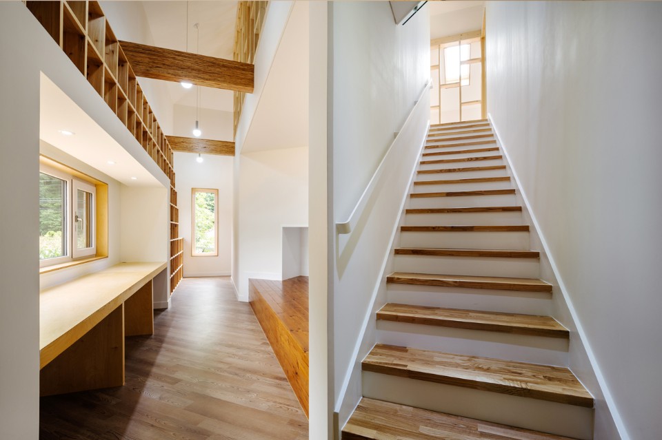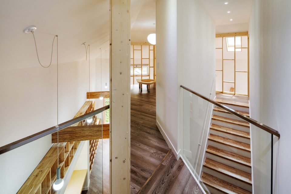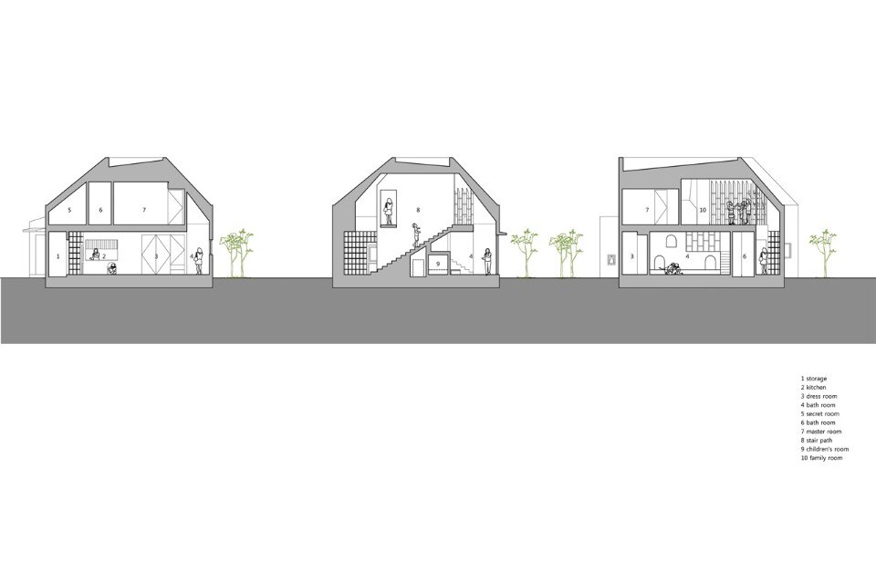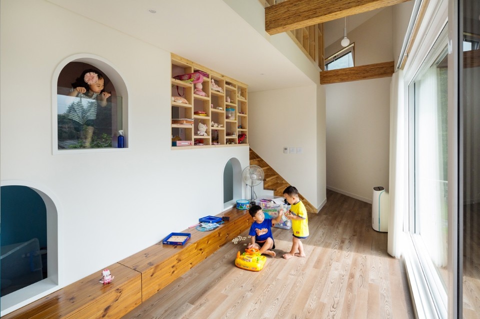 Moving on through the toilet and washbasin, one can enter the living room and the mezzanine room for children: this place is open to the yard so that the family can spend most time here. Next, one can see a dress room by opening the wardrobe door, and passing through the kitchen and the dining room, meet the front door again. With the beginning turning back to the end, this path keeps circulating and extends to the play room and the loft on the upper floor. The loft leads again to the ground floor, to the living room, and to the outside: in this circulation, children run and run tirelessly.