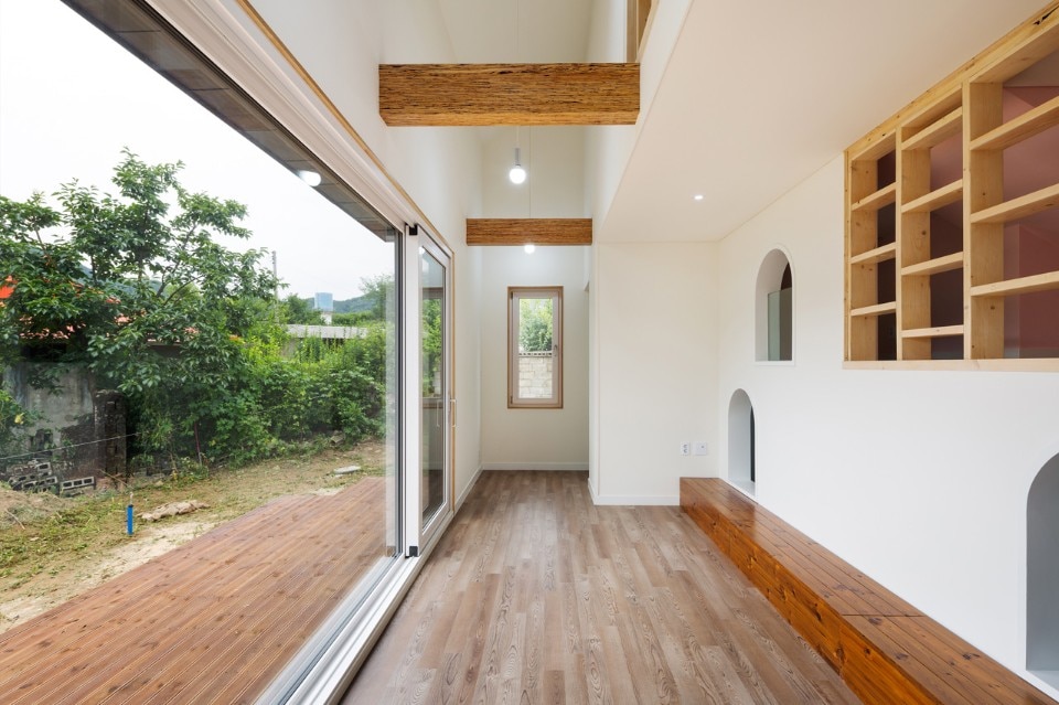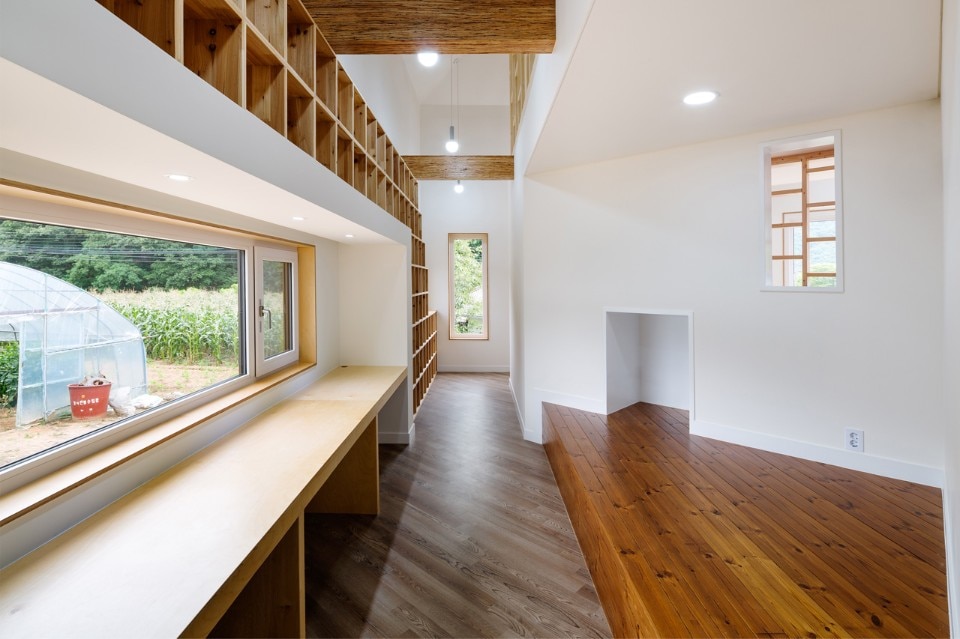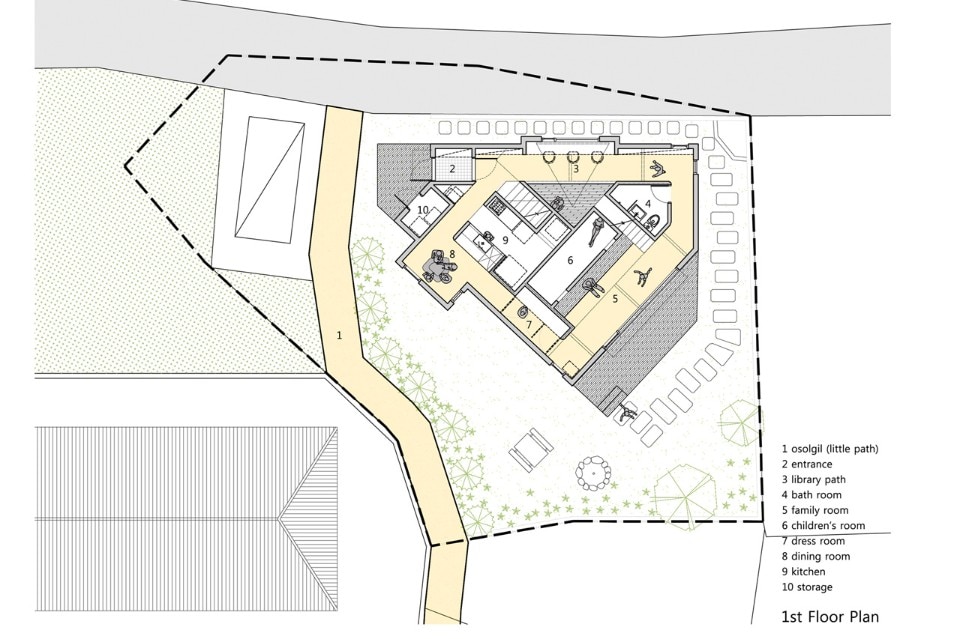 There was one big issue for the site to build a house on: part of the site was being occasionally used as a passage for villagers. Giving the way out to the community should necessitate a sacrifice of much part of the site, or blocking it would probably make discomfort for the community. Breaking through this dilemma was the client’s willing suggestion to maintain the way as it is. For the client who had lived as children in this community, the villagers signified more than the mere neighbors; they were well aware of how much significant the existing way was for the village. The way surrounded by small trees and grass which served as a key inspiration for the design.