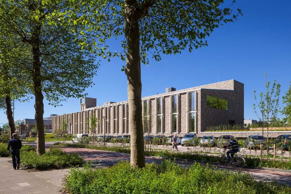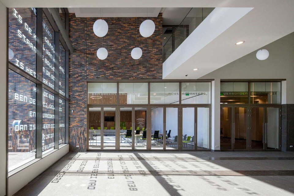 The lively, brick facade is opened up by large areas of glass across the entire expanse of the building. The inviting entrance is also predominantly glass. As soon as visitors enter the building the lay-out is immediately clear. The building comprises a simple division into two sections: a public area and a working building. These two sections converge in a light, lively atrium.