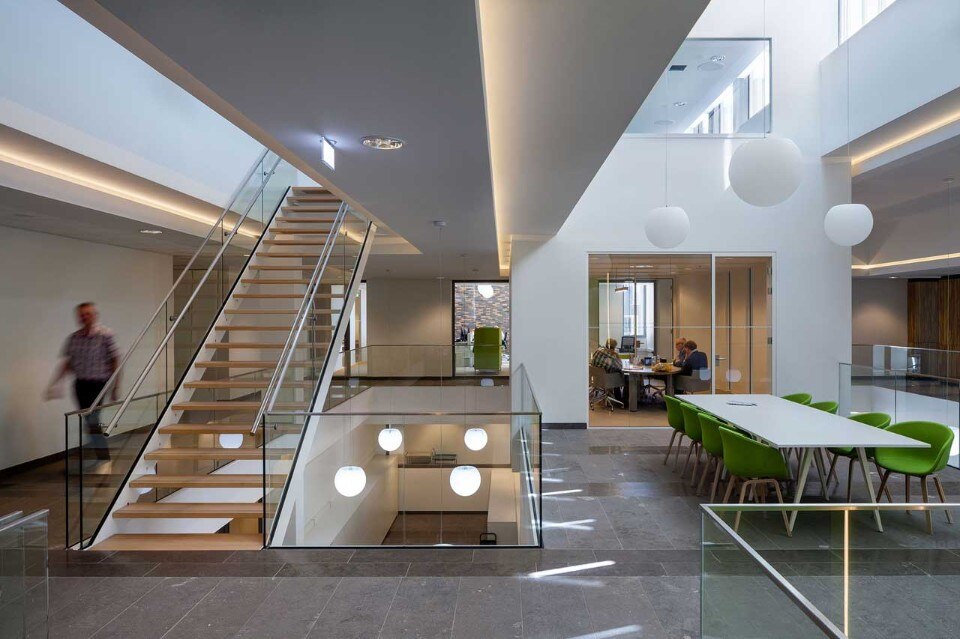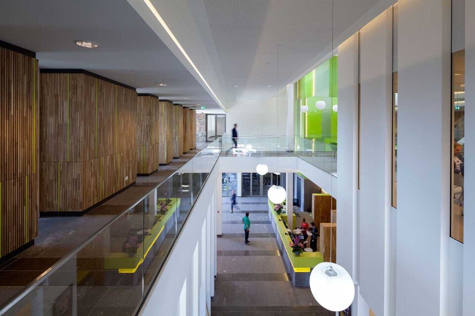 Natural materials such as wood and stone have been applied in the interior. This is combined with fresh green accents creating visual harmony within the building. Optimal acoustics, an abundance of natural light and a playful layout make the town hall an attractive, inspiring place to be, where both visitors and staff feel at home.