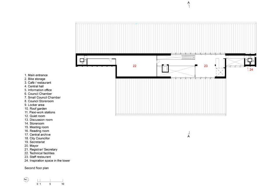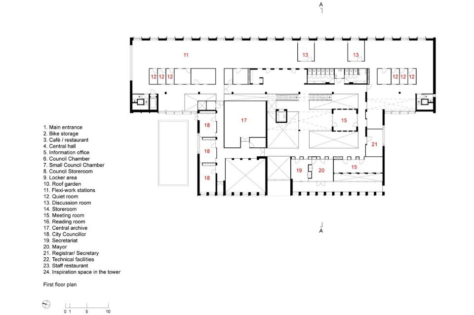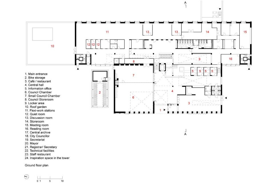 This is where the council, the civil servants and the public meet each other. It is the key place in the municipality where knowledge can be exchanged and new alliances can be formed. The public area on the ground floor includes, among other things, the Civil Affairs Department, the Council Chamber and a restaurant, with the offices of the Mayor and City Councillors on the floor above. The back office is situated on the other side of the atrium, above the sunken car park. The back office works according to the New Way of Working concept and has a wide variety of workplaces. The separation between areas that are open to the public and the working areas is designed to be self-explanatory, without any tangible restricted access and everyone knows where they should be.