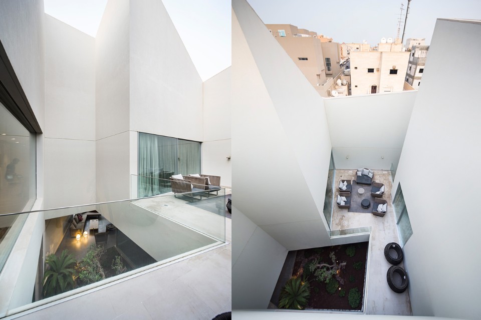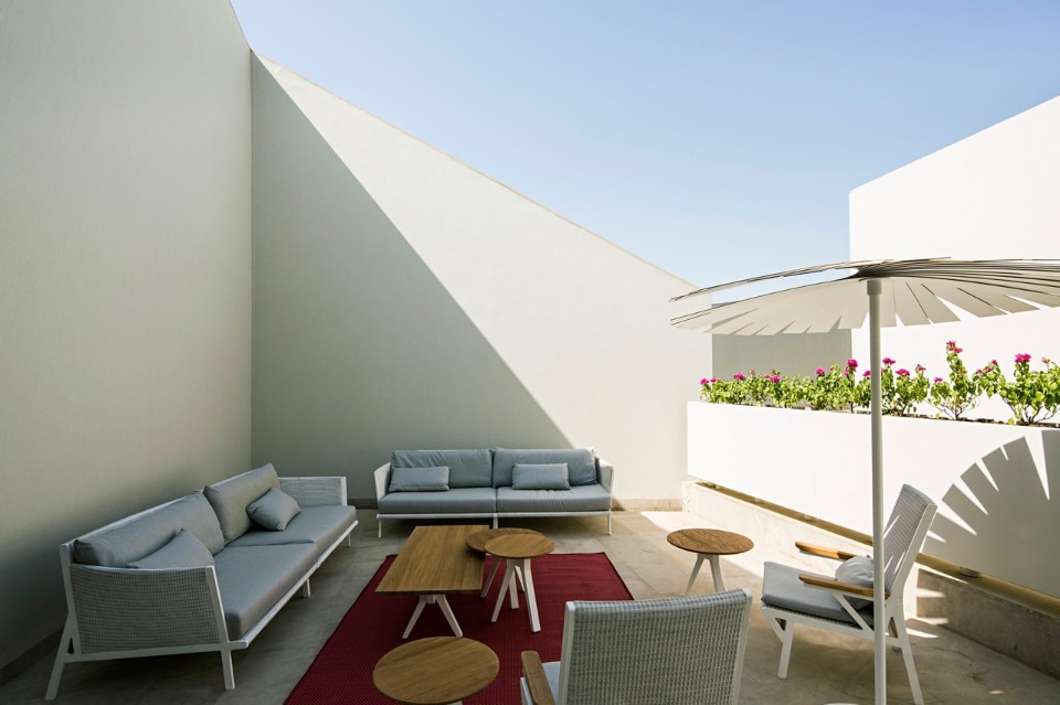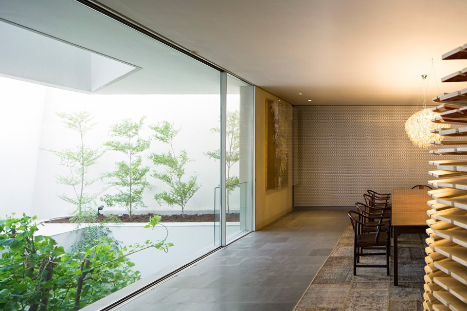 The three daughters can develop their private life around three patios into the highest level of the house. A shared living room is extended to the terrace where in the mild weather nights, friends and family can relax, chat, eat and socialize. The open air terrace is connected with the mother’s private garden on the lower level without any visual connections.