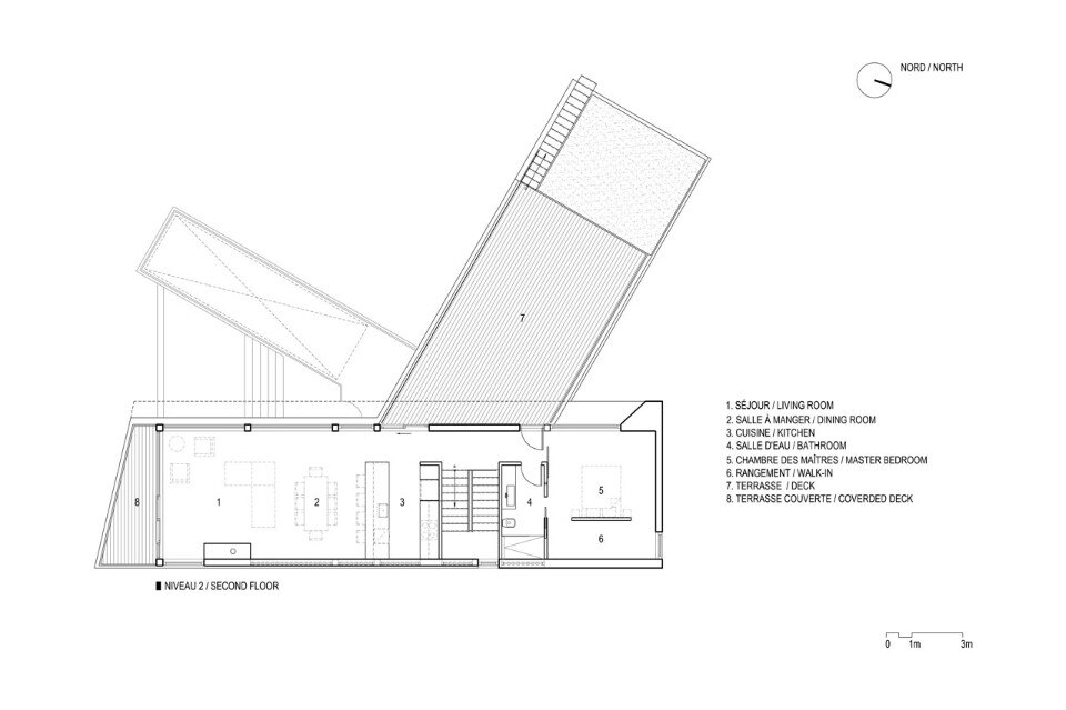 This house is located in Cap-à-l’Aigle, in the region of Charlevoix. What makes the house stand out is its “V” shape and long facades that are suspended over nature. While discrete from the street and closed to the north, it unfolds toward the river.