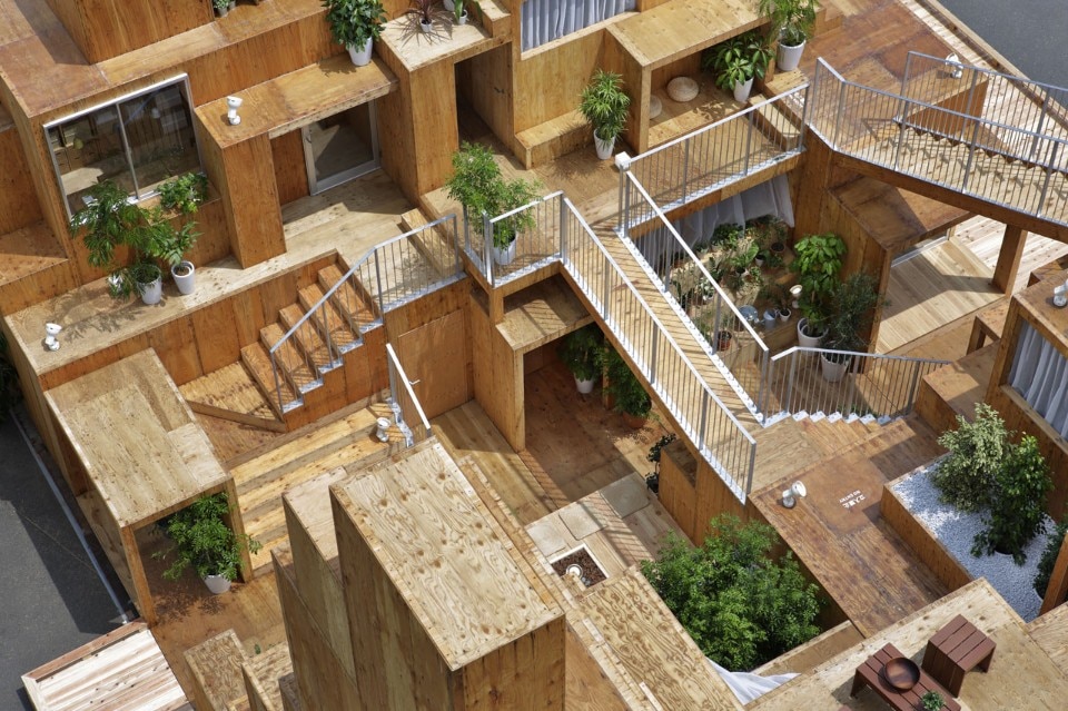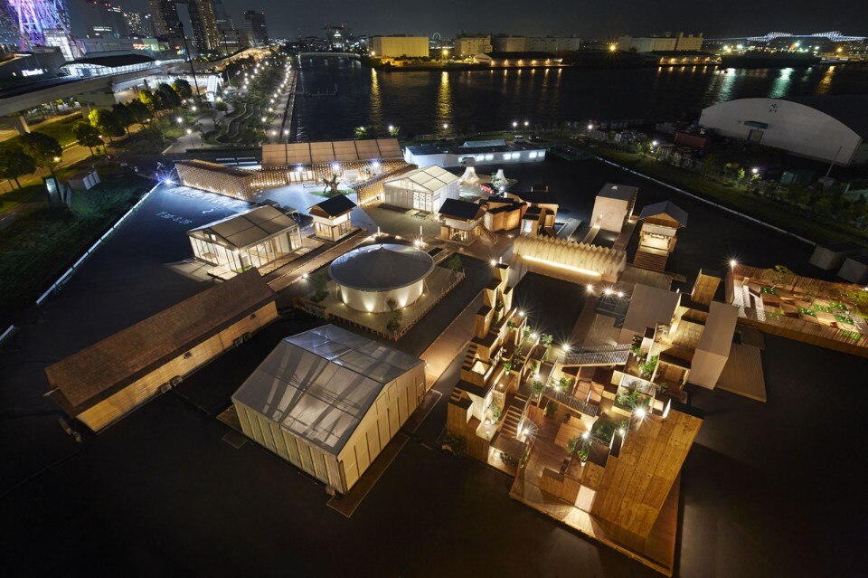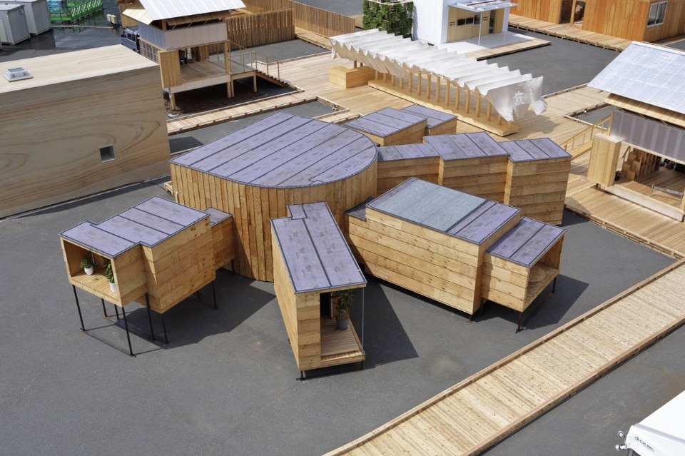 Architect Kengo Kuma was in charge of the exhibition design, creating for the access a wall-like structure by weaving lumber squares rhythmically. Given the short length of the event and the need for quick construction, most of the houses favored the use of wood and were presented rather like small pavilions organized consecutively by number around a walkway. Many of the projects were also planned to have a second real life and transported to other locations after the event.
