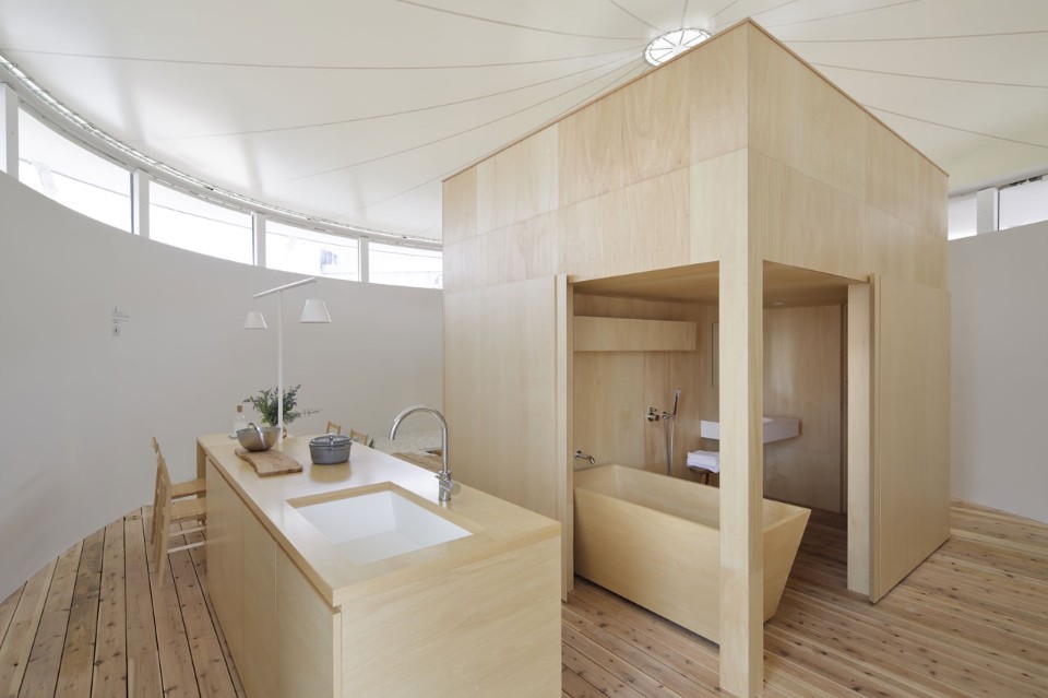 The third project by architect Yuko Nagayama and a major electronics manufacturer aimed to create “a house based on wealth of experiences”. Containing the space with a simple spiral wall in reminiscence to the Japanese language hiragana character “no”, it allows a continuous experience from outside to inside becoming a complete interactive surface. Being probably the most futuristic of all the projects presented in the show, the tent-like roofed structure is a nomadic prototype that could extend and facilitate the needs of the user with the immediate environment in the coming future.