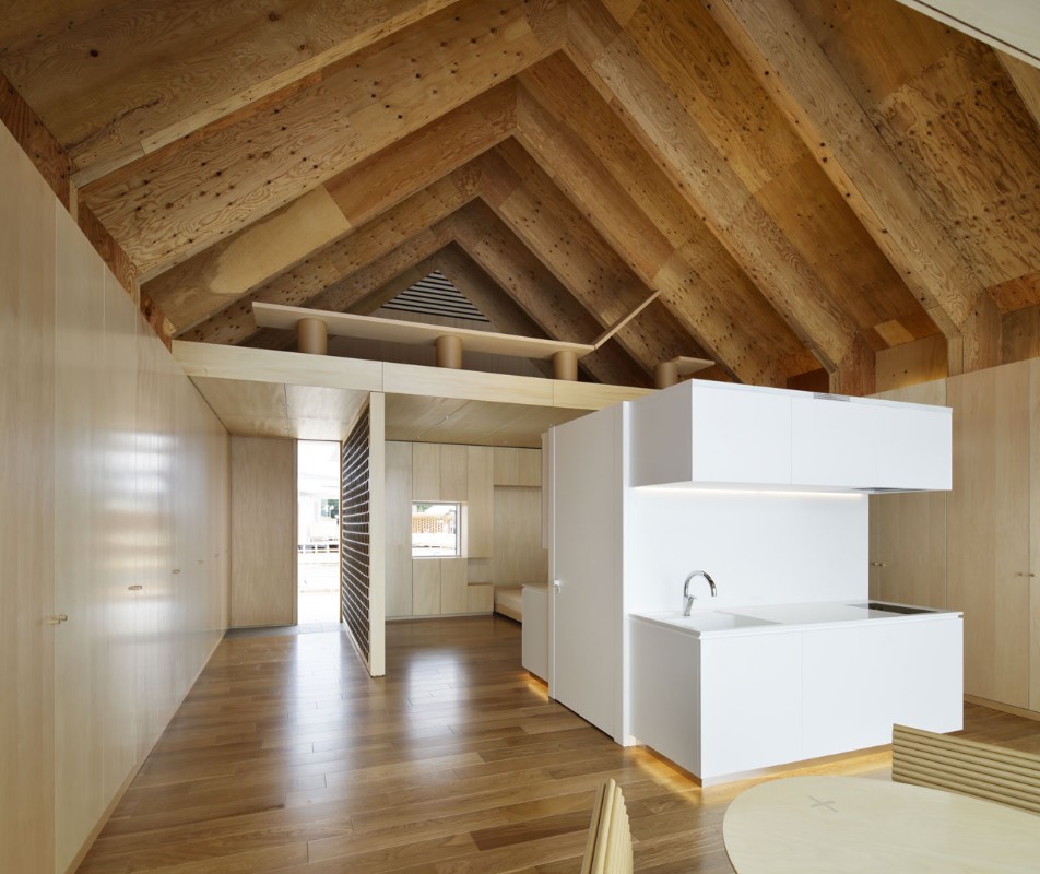 Designed by household and consumer goods retailer Muji in collaboration with the architects of Atelier Bow-Wow, the fourth house is a compact structure constructed in wood. It was thought to be placed in the village of Kamanuma, some 70 kms south from Tokyo in the Boso Peninsula. While the ground floor is rather an open space (ryuten) with external shelves to store tools, the upper floor is more contained but leaving lift-up shutters to have 360-degree views of the agricultural landscape for an office space.