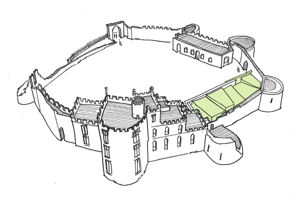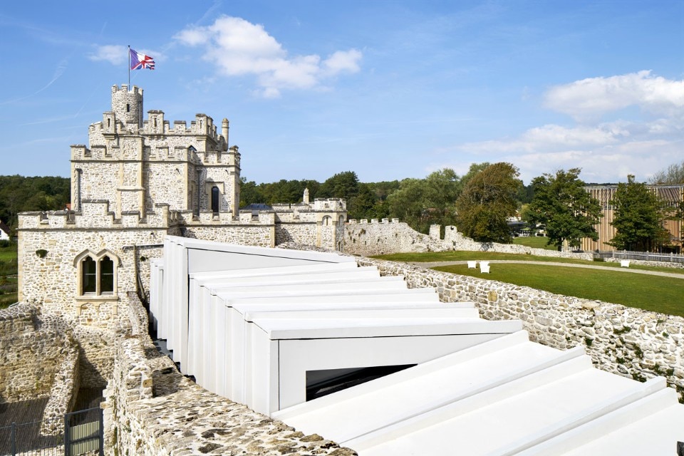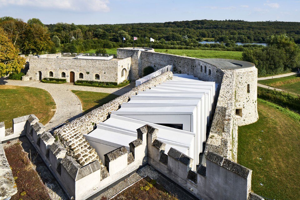 Salvator-John A. Liotta + Fabienne Louyot: The exposition rooms are inserted between the mediaeval bailey (the outer wall) and the rampart walk. Your design is characterised by few elements, but they are clear and recognisable. On the outer side of the enclosing wall, where a path leads to the castle, we see what seems to be a suspended white roof looking like a piece of “ghost architecture” on top of the walls. It is a box with pure lines that trace out a profile similar to the Château d'Hardelot.