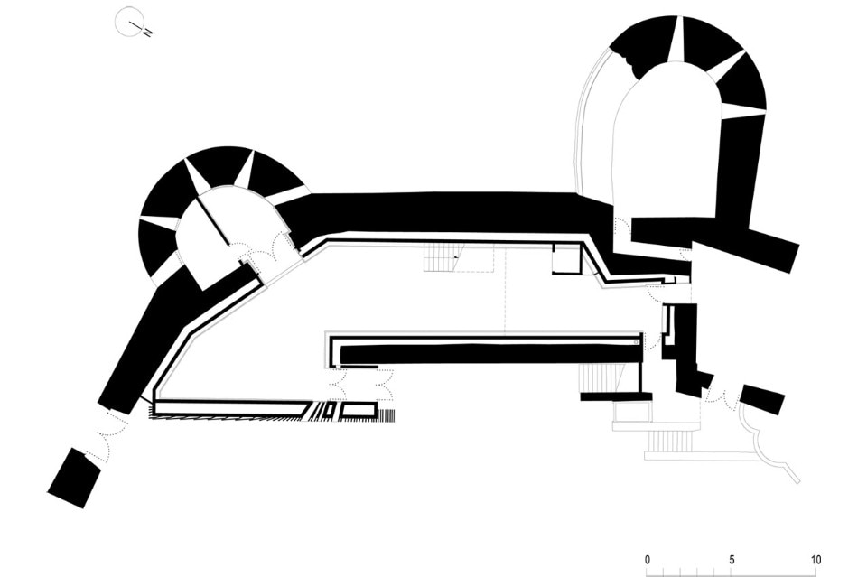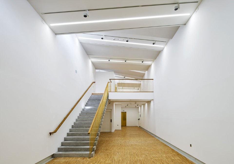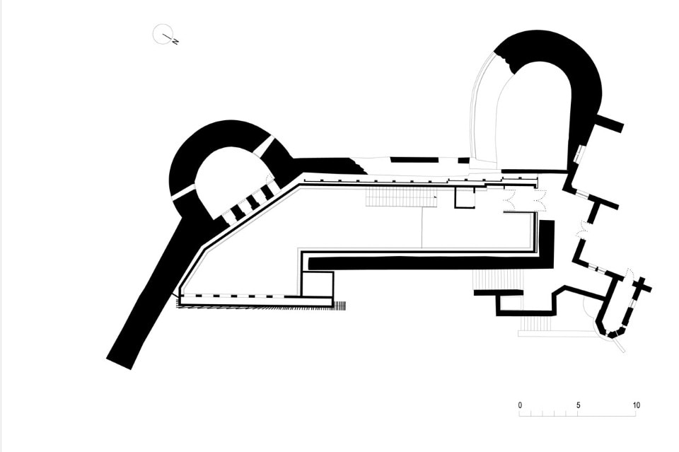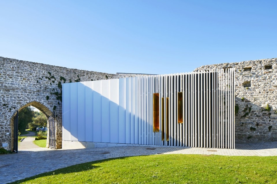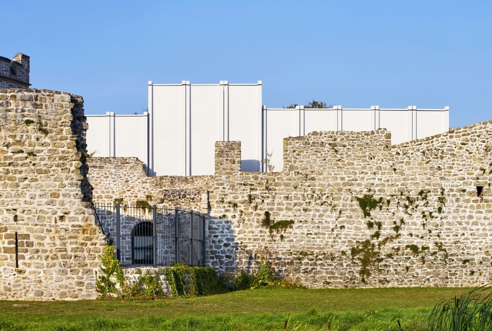 Silvana Bartoli + Celine Medina: The extension is inserted delicately into the context. What we see emerging from the walls expresses appreciation for the existing construction and announces the presence of a contemporary structure that is not fully revealed. The differing angles of the new roof’s slopes are given by the morphology of the preserved bailey. It was included in the programme that we needed to rest the beams of the new roof on the existing walls, but we preferred to build without using the old structure at all, to create an independent volume. It is a complete box. There are neither eaves nor rain pipes, because we inclined the walls slightly, enough to satisfy the requirements of the technical control office. This is to the advantage of the heritage building and results in clean lines for the extension. The exposition rooms have a variable height that allows the cultural centre to adopt different types of displays.