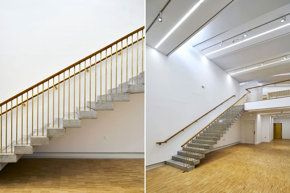 Silvana Bartoli + Celine Medina: The exterior is sheathed in precompressed fibre concrete panels in different shades of white, giving an abstract appearance to underline that it is a modern addition. We opted for an industrial hardwood floor in oak, made of remnants. It is thick enough to not get warped over time. We used brass to indicate the route inside the cultural centre, and also for the entrance doors and stair railings. Brass used to be employed to face walls and in the construction of the ships that sailed back and forth from France to England before it was substituted by anodised steel. We wanted to bring back this historical material by integrating it into our design as a noble insert, so we used it for the interior “navigation” of visitors.