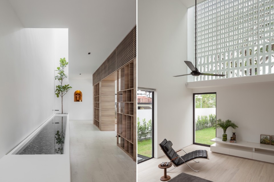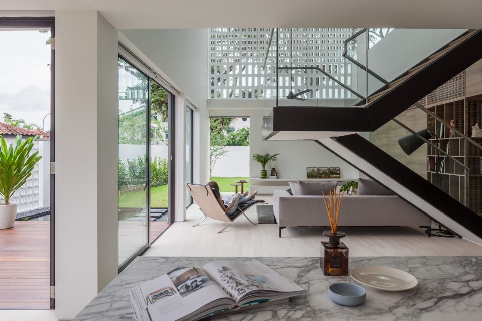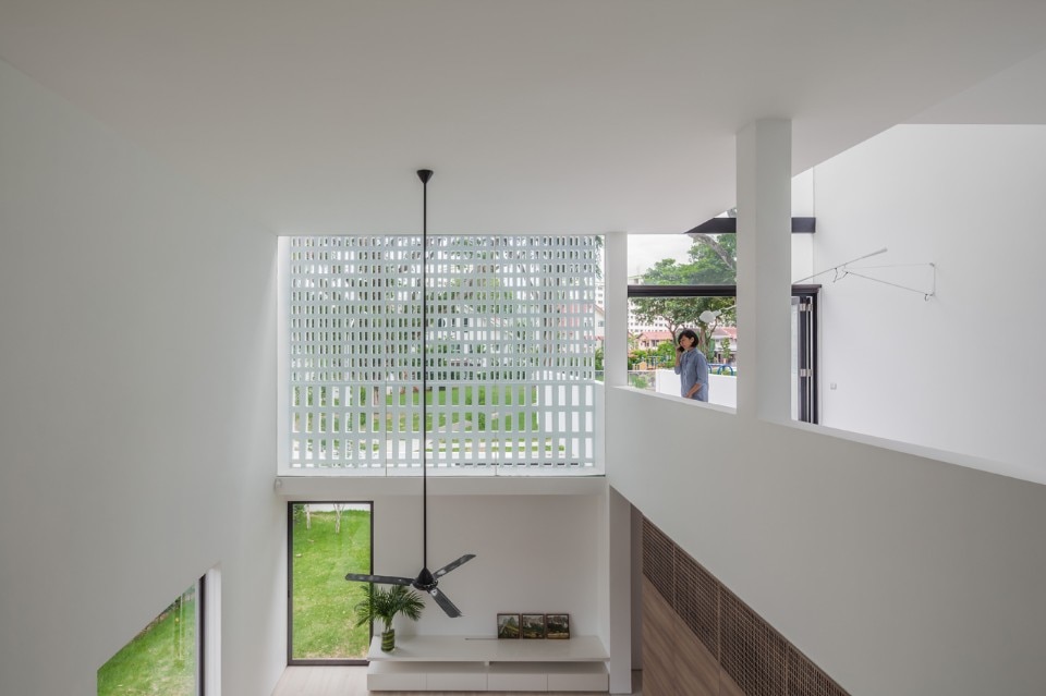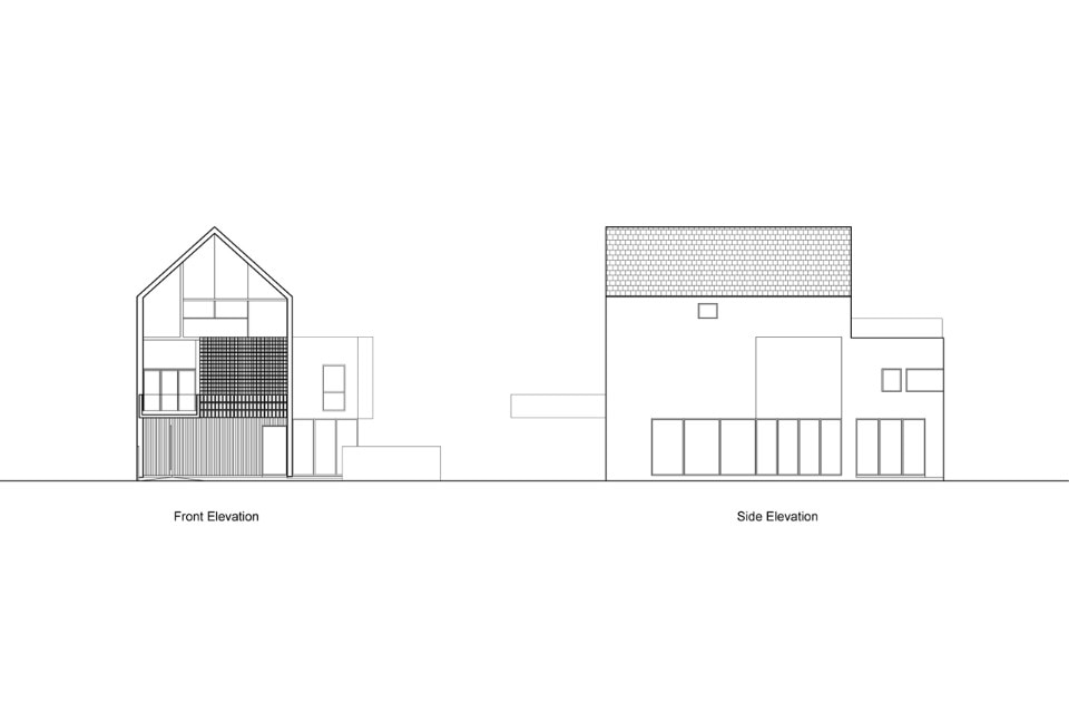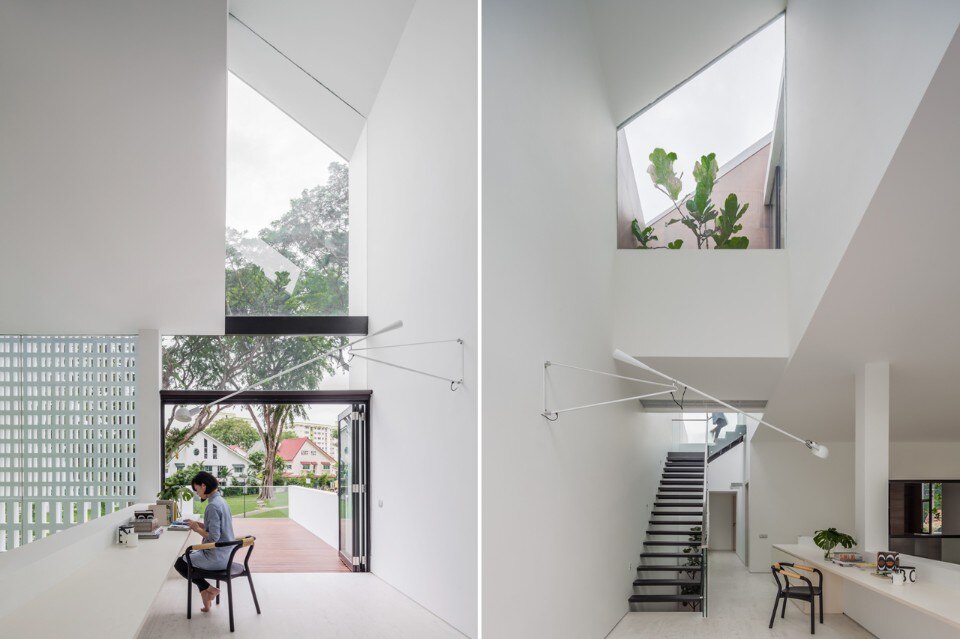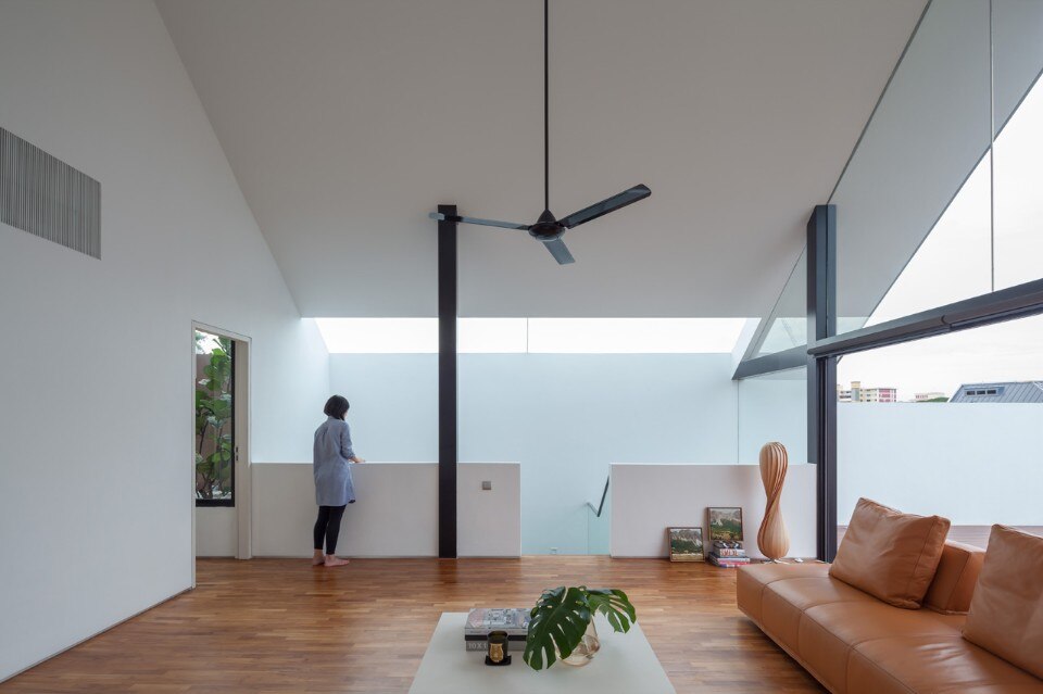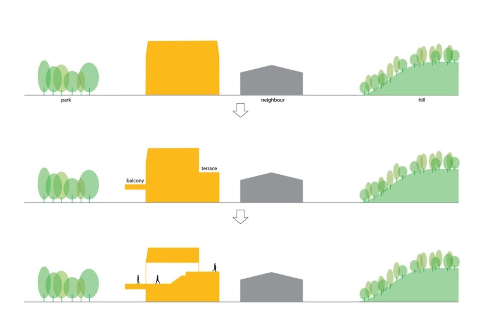 At the back, an open roof terrace cuts back the house massing above the rear neighbors to take in views of the distant forest hill. Between this two ends, internal rooms are pulled back to create a non-linear spatial passage from front to back, shunning the view of surrounding neighbors. This internalized private ‘climb’ from park to hill, through the passage, forms the main spine around which the rest of the domestic spaces are arranged.