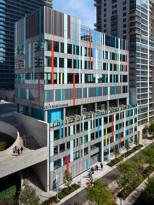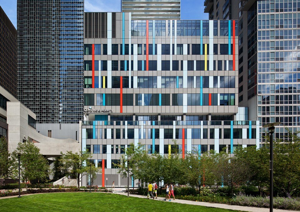 With its playful facade, the building provides an aesthetic contrast within the context of an otherwise neutral neighborhood. Made of gray aluminum plates punctuated by primary colors, the curtainwall responds to the varied internal program elements and the school’s busy, day-to-day functions activate the surrounding area. Inside, classrooms are organized along the south side of single loaded corridors to maximize exposure to natural light and city and park views.