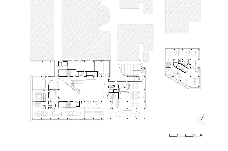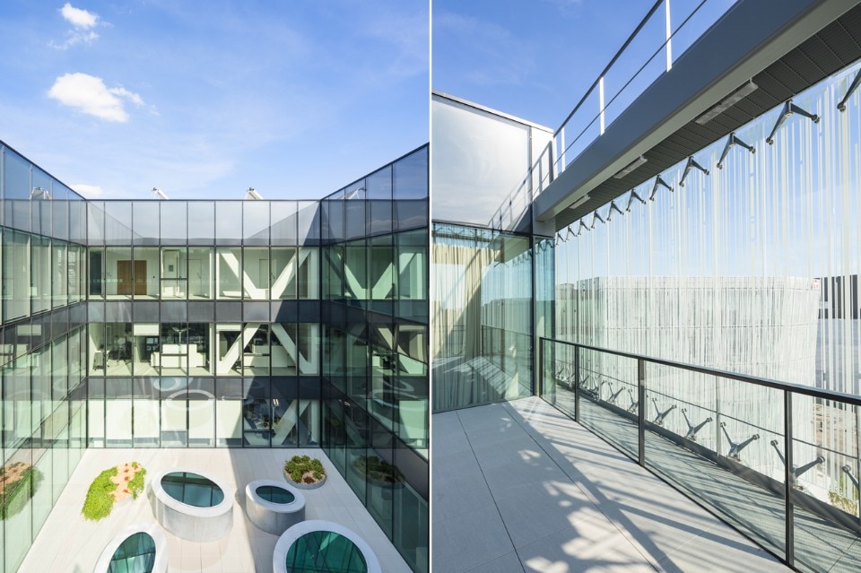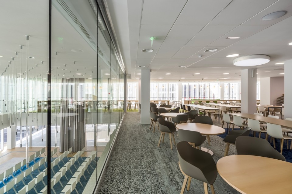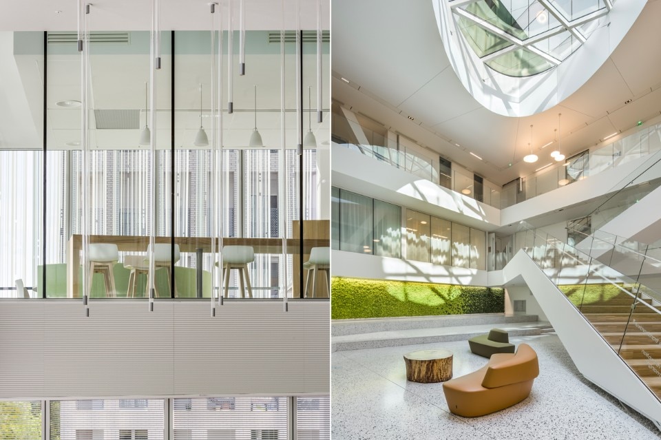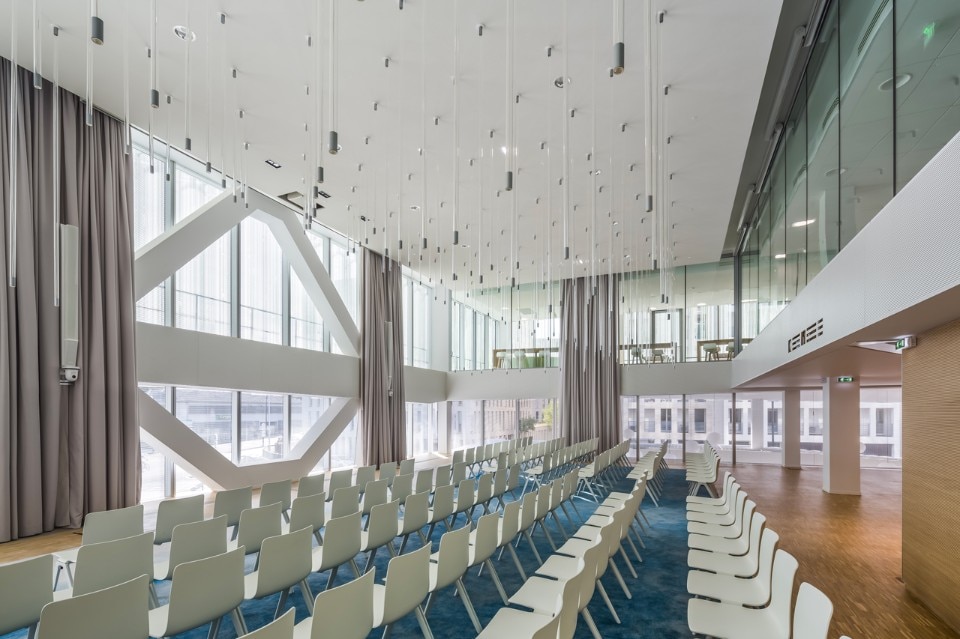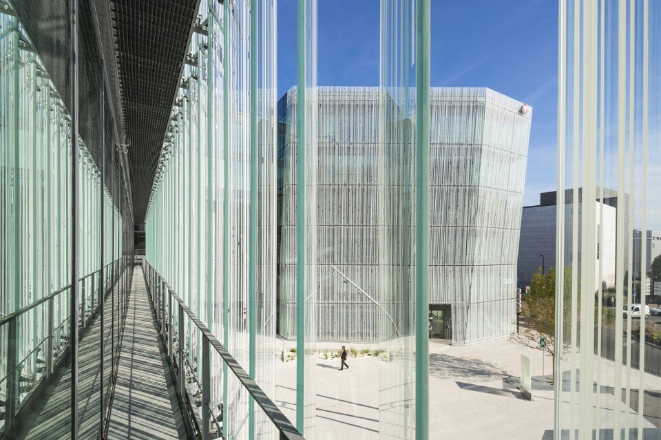 The top floors are comprised of standard offices, and the C-suites, while the ground floor and the lower floors house public and shared functions: exhibition gallery, meeting and reception rooms, café, and restaurant serving the entire site, distributed around a broad atrium. This configuration ensures that all the offices benefit from equivalent spatial qualities and quality lighting. In addition, it fosters optimal communication between occupants and users and easy navigation of the site thanks to looping circulations.