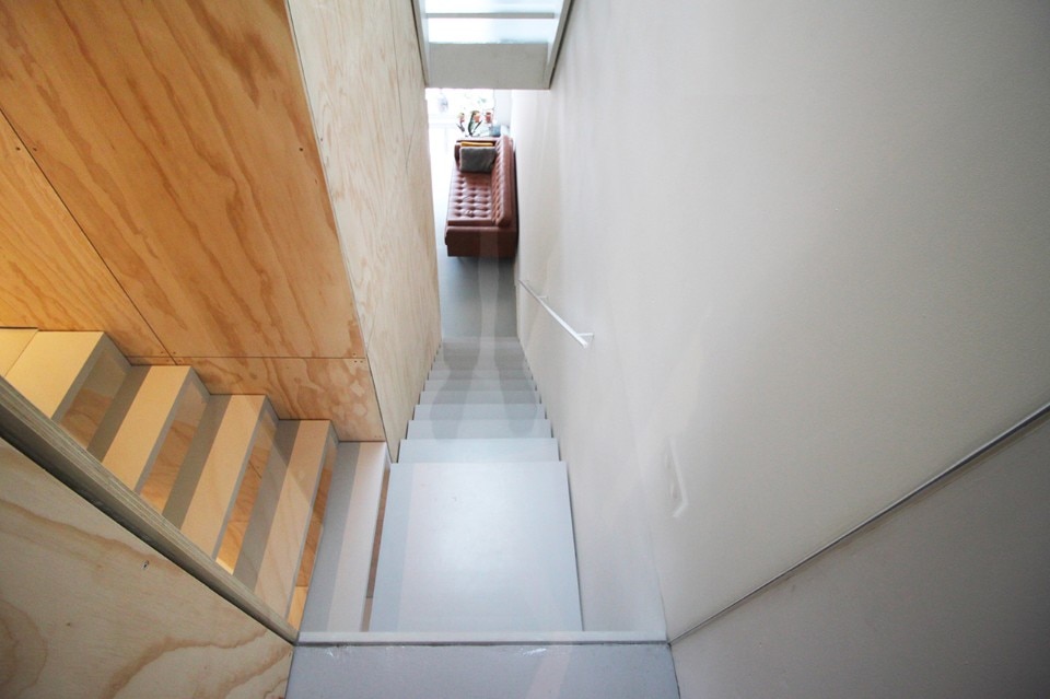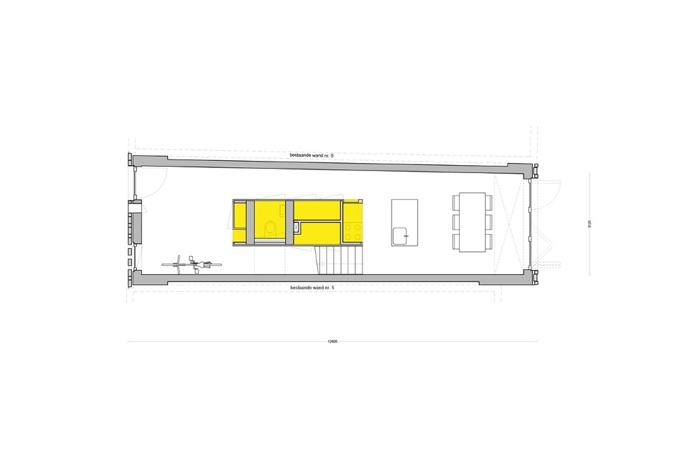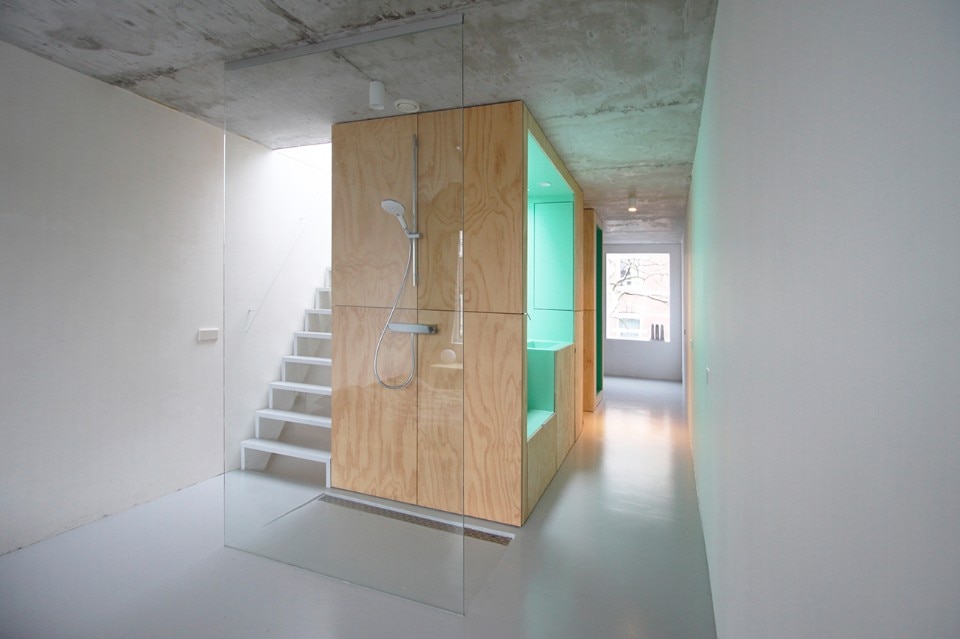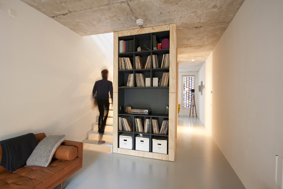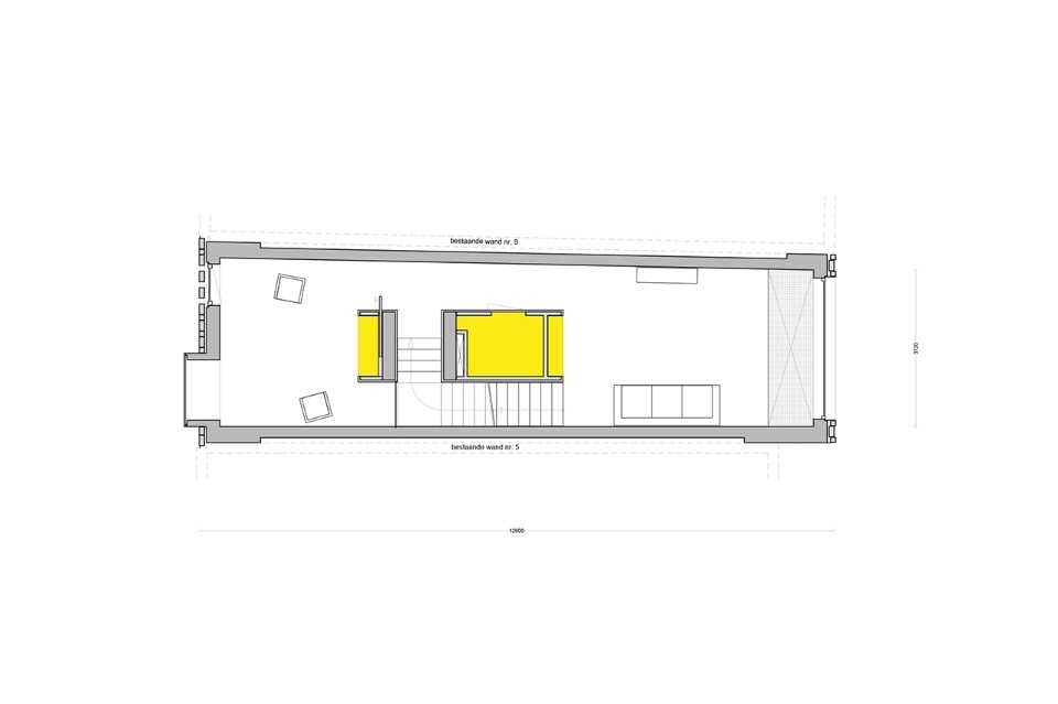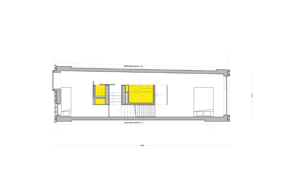 The extreme proportions of the plot, only 3.4 meters wide and 20 meters deep, result in a stacked open loft typology while it was a constructional challenge. Being this narrow and long in relation to the height, a massive foundation and load bearing structure were needed. Hence an elegant solution of two parallel reinforced concrete slabs was introduced in the interior of the house.