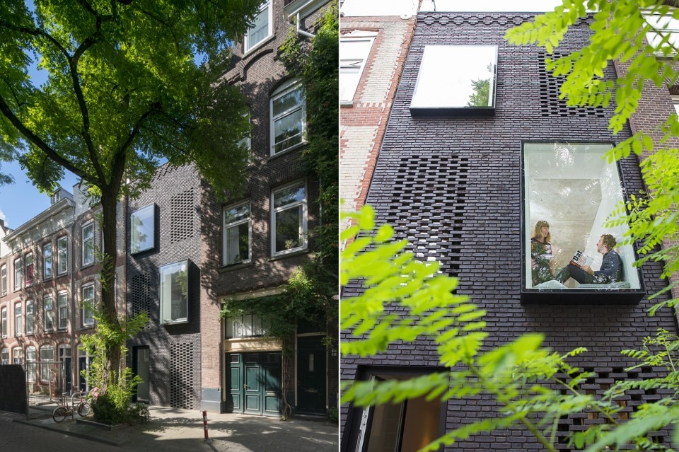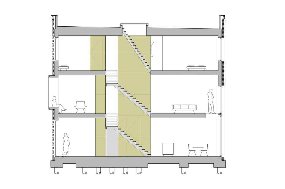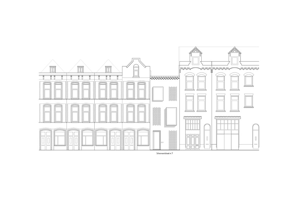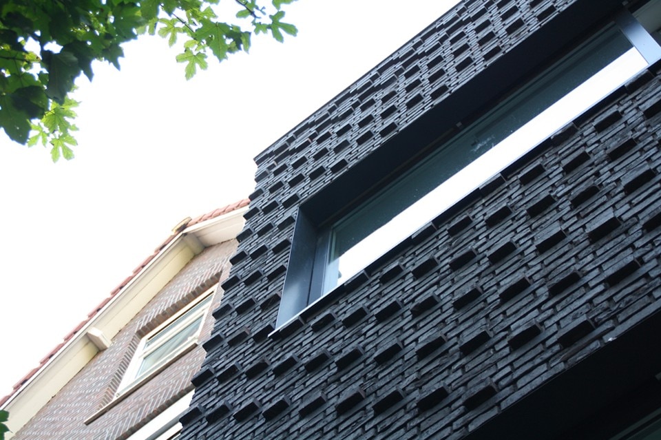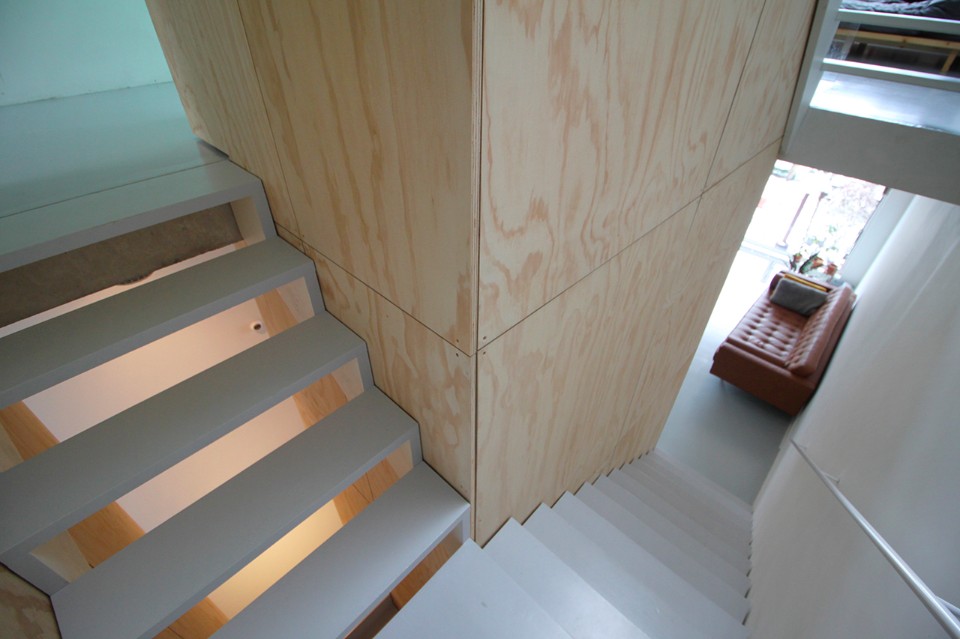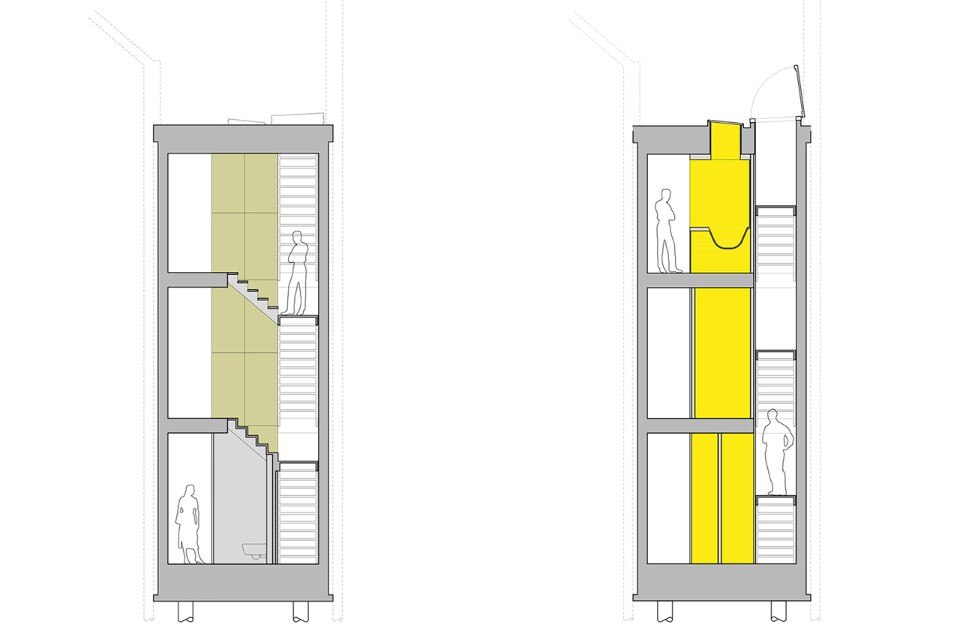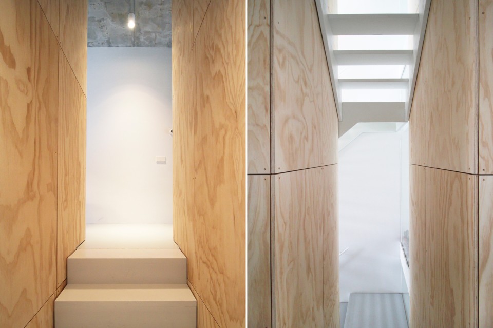 The extreme proportions of the plot, only 3.4 meters wide and 20 meters deep, result in a stacked open loft typology while it was a constructional challenge. Being this narrow and long in relation to the height, a massive foundation and load bearing structure were needed. Hence an elegant solution of two parallel reinforced concrete slabs was introduced in the interior of the house.