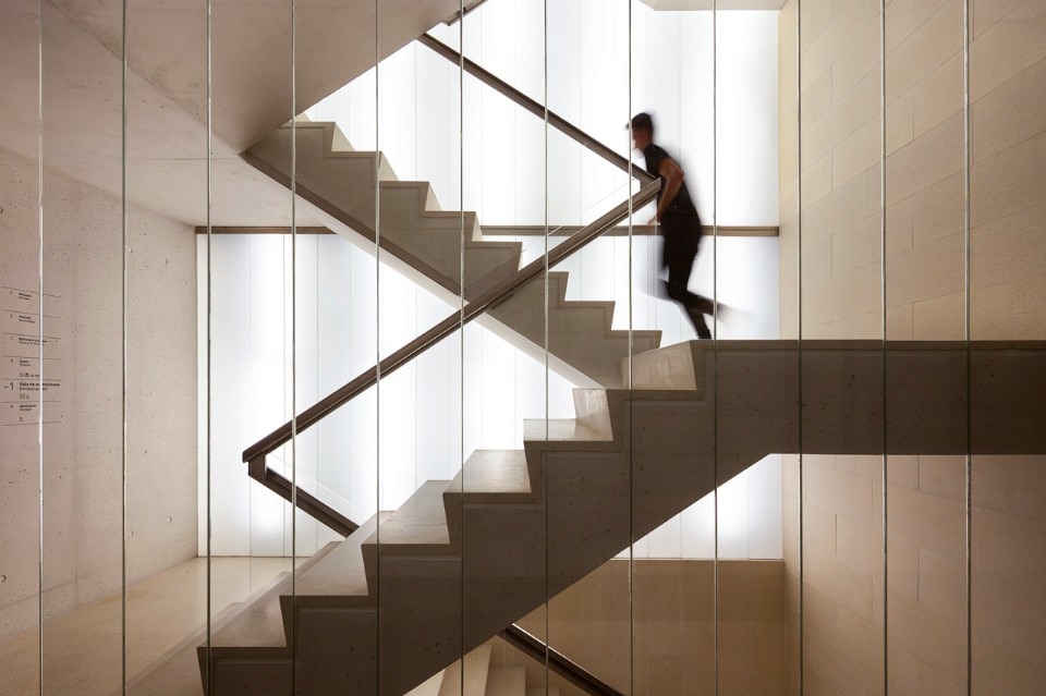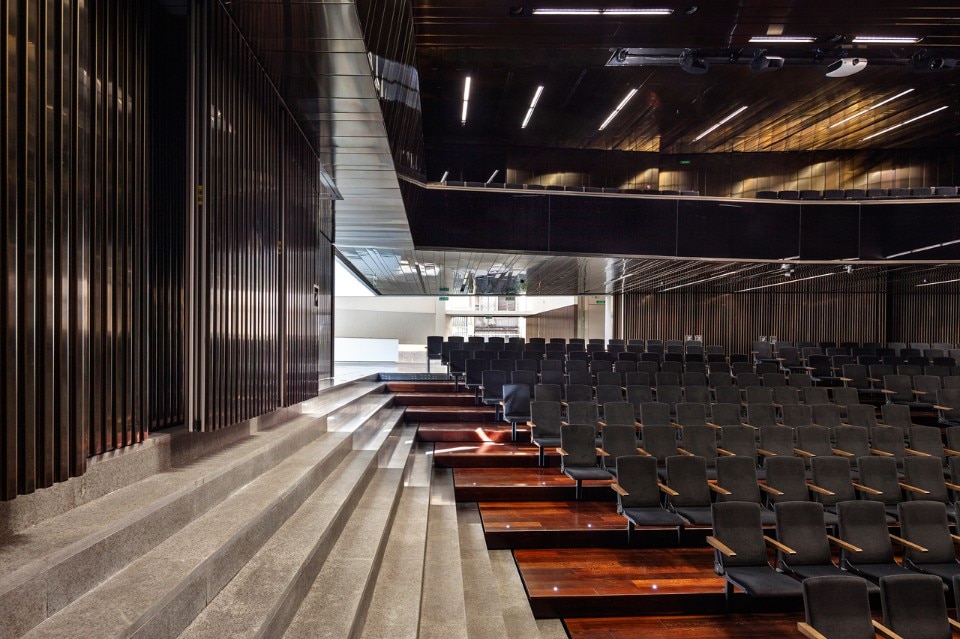 The building, comprising two volumes of 4,700 sqm, is laid out in a succession of different flexible and expressive spaces that house the various cultural uses. A 400-seat theatre equipped with a acoustic shell and mobile walls that soundproof it from the foyer and provide the necessary quality for concerts and plays. A library made up of two spaces of different heights, for the book stacks and the reading room, which offers views of the suspended box that is the iron-clad archive where the poet’s original manuscripts are safeguarded. There is also a gallery of generous dimensions that occupies the basement, plus a cafeteria, a shop, offices, storage space and services.