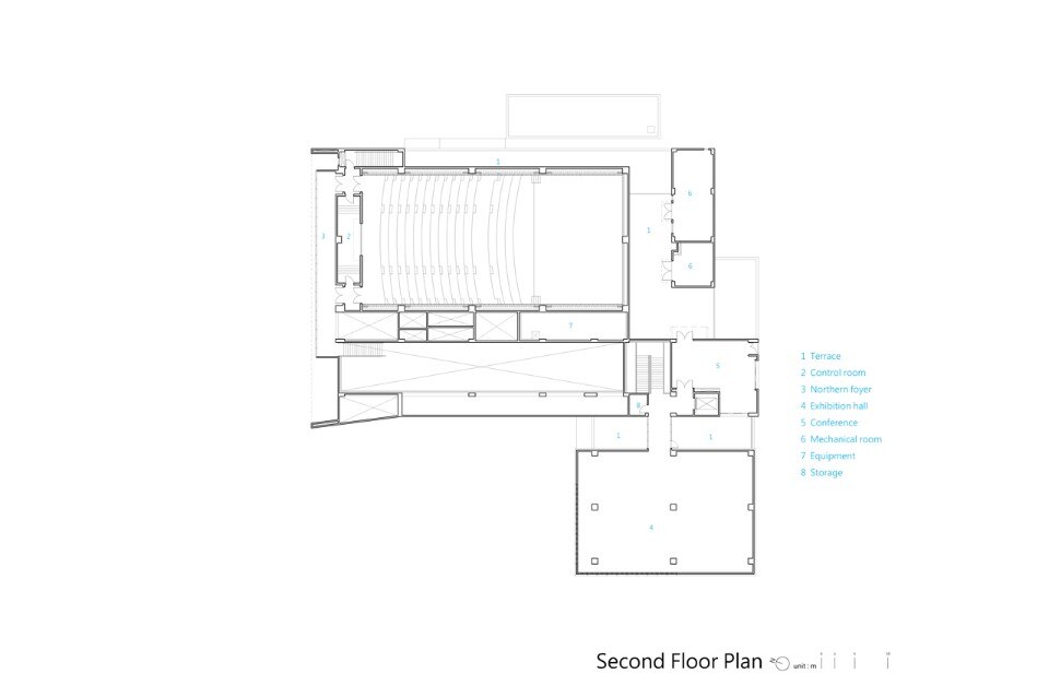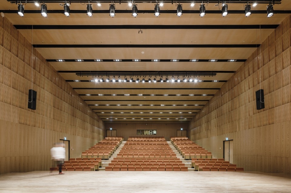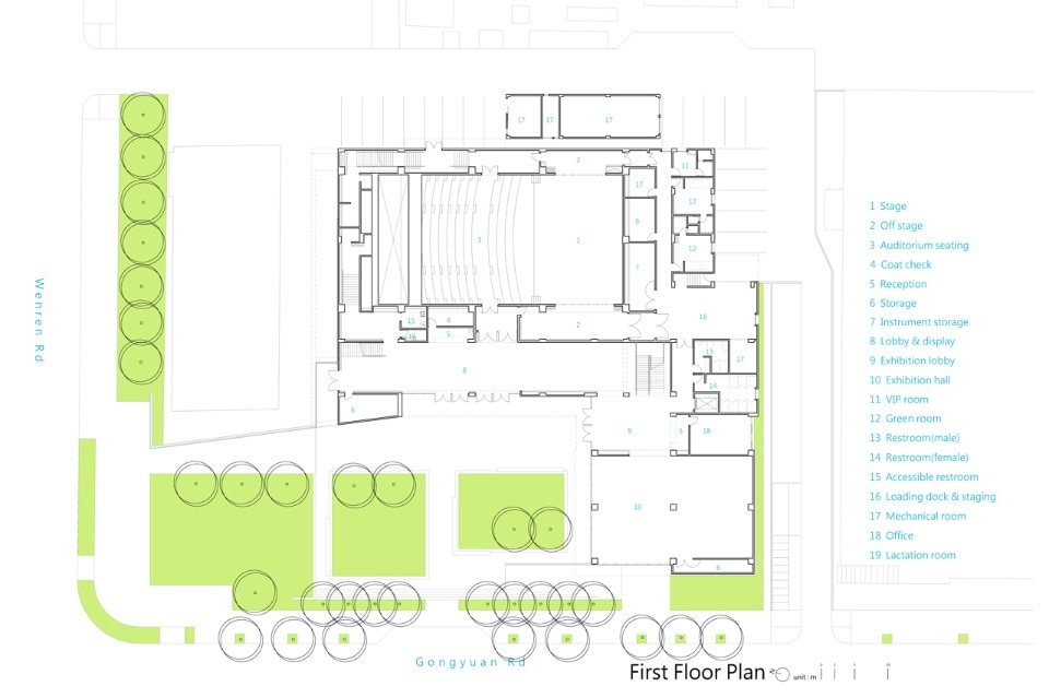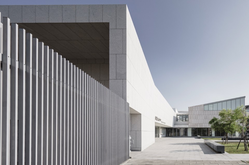 The L-shaped building is further divided into two volumes, responding to the adjacent street intersection. The larger auditorium volume and the smaller exhibition hall volume are each sheathed with different types of granite.