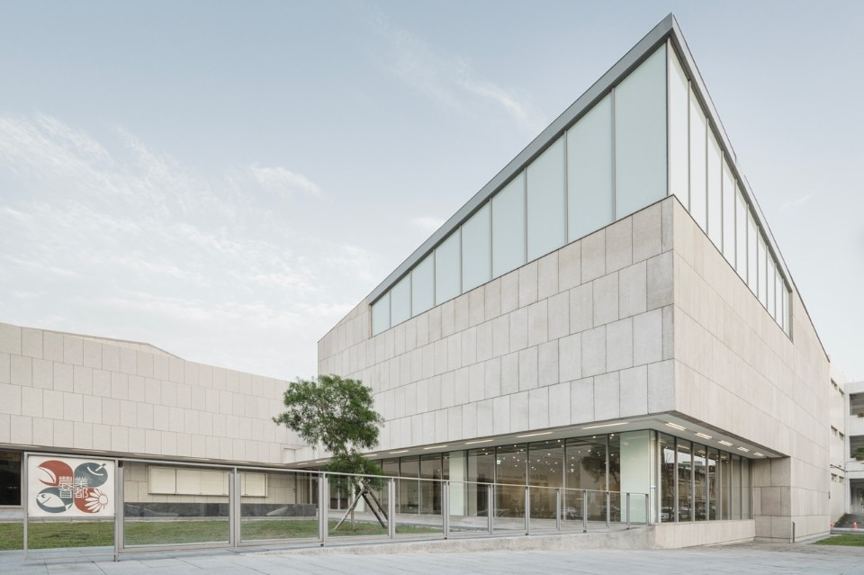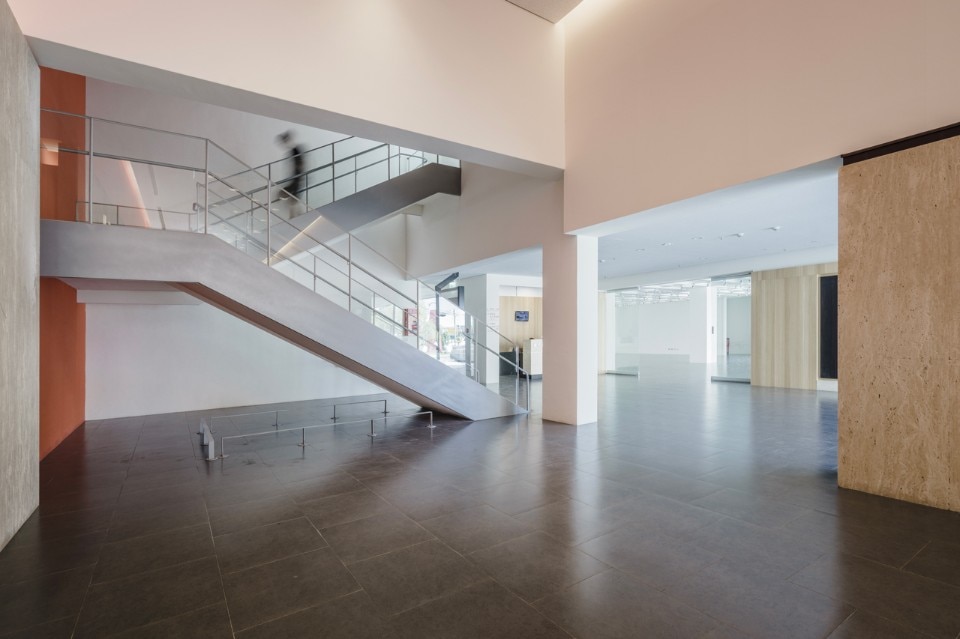 The plaza in front of the building varies in elevation, and elongated stairs form the linear edge along the paved walkway next to the adjacent street. Unique in Taiwanese cities, this site planning creates subtle grading variance and generates dynamic visual effect that changes with viewing angles.