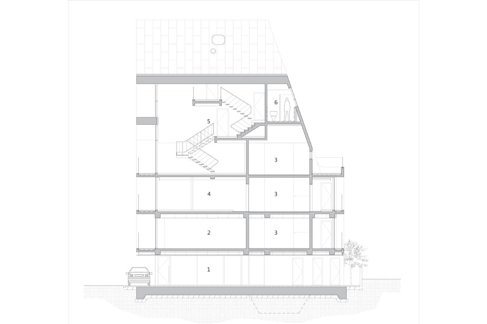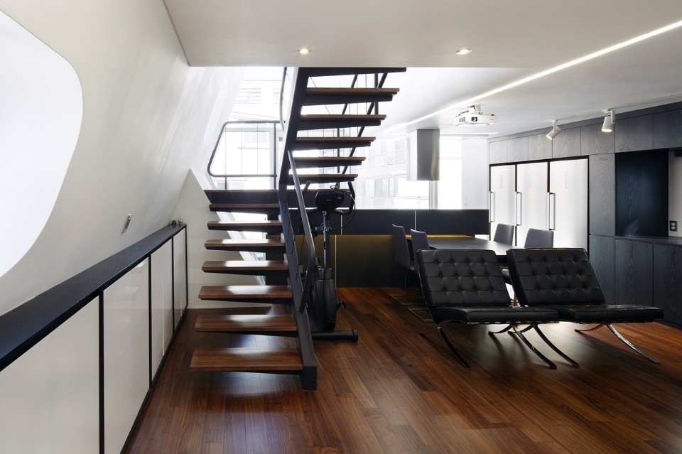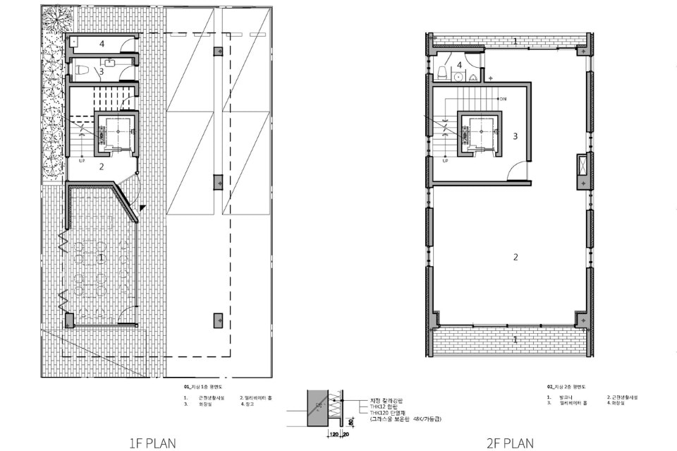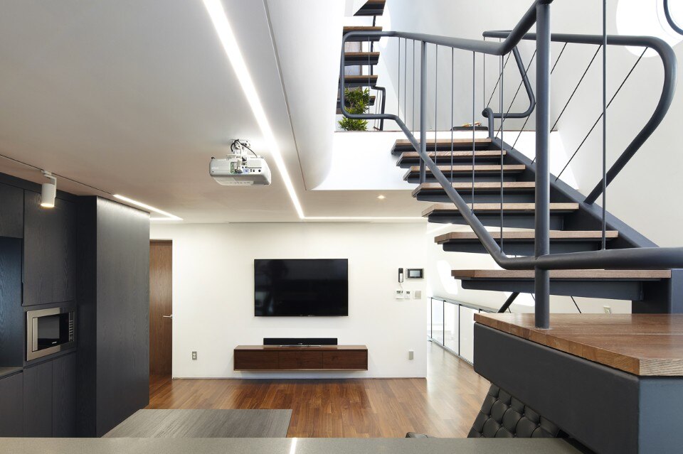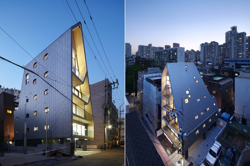 Concrete is the main material of the buidling. To increase outside insulation performance and be safe from water leak, a colored-steel sheet was put like as a blanket covers the mass from the end of the roof to the first floor celing along with oblique face. It was not easy to find scenic view in the collective housing area but by allocating balcony spaces excluded in gross estimation and round windows and doors as many as possible along with oblique line, the building is well-lighted and commands sky view.