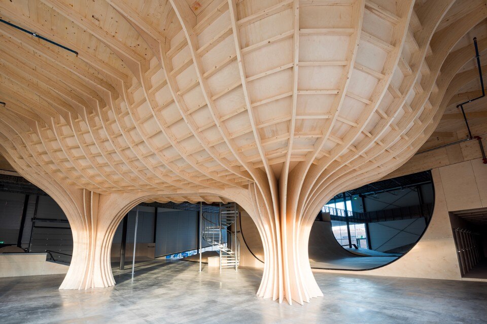 The main skating activity is situated on the lower level, which features a high ceiling giving ample space to custom-built skating elements. These were designed and constructed jointly by Glifberg+Lykke and IOU Ramps. A unique feature of Oslo Skatehall is the raised bowl, constructed in wooden materials. The structural elements of this burgeoning organic form can also be viewed from underneath. On the upper level, a separate viewing gallery spans the entire length of the hall, allowing spectators a clear overview of skating activities below.