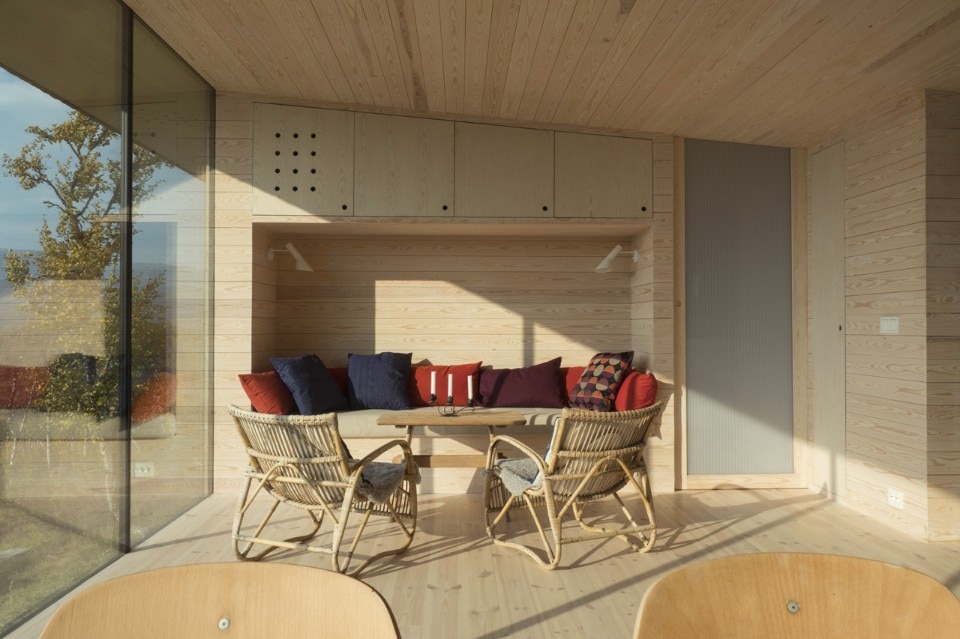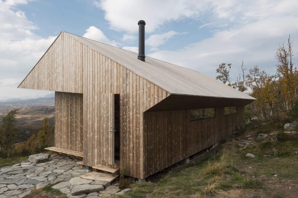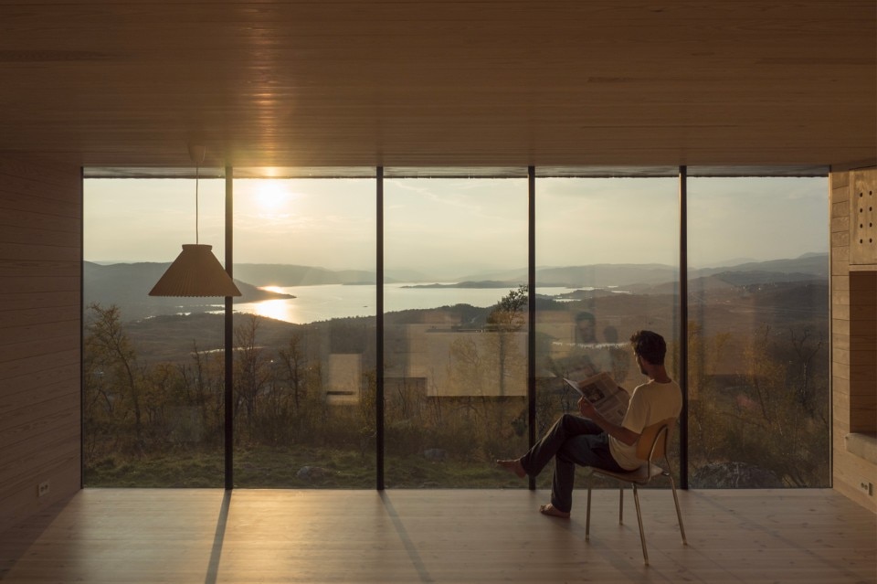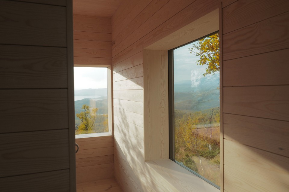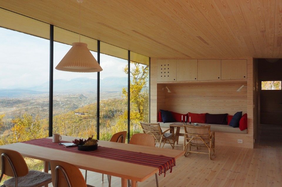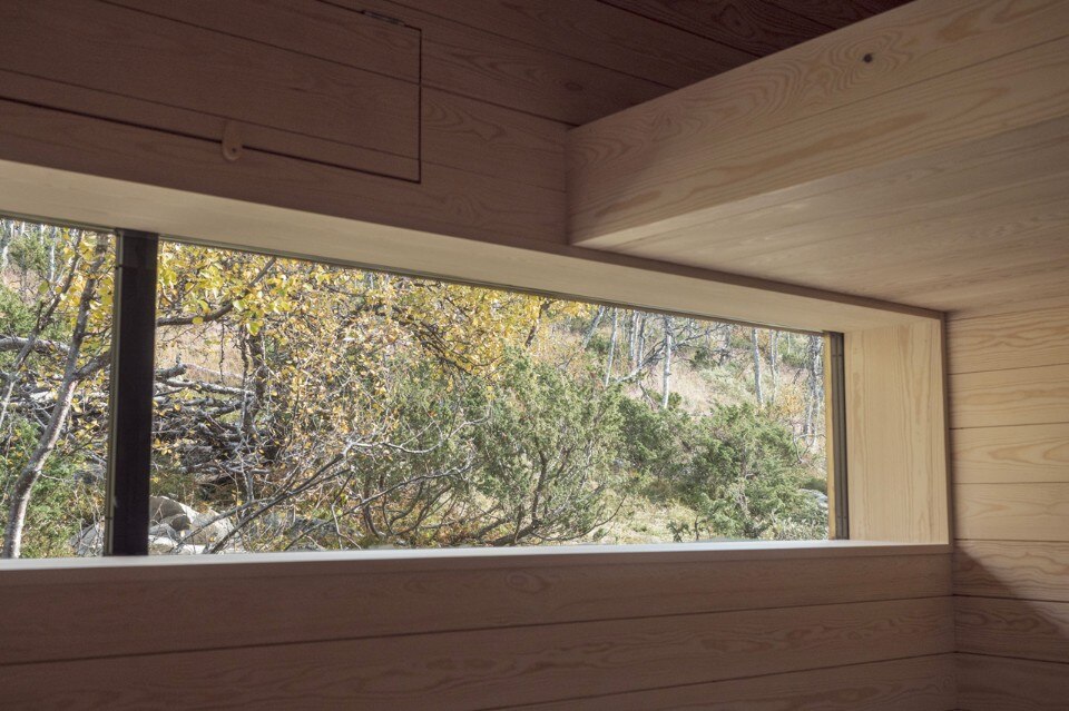 The cabin is clad in pine, inside and out. Three-layer, insulating and solar protected glass panels take in the view of a lake, a mountain formation and a glacier all in the same panorama. With this view in mind, the idea for the main room was to create the experience of being outside – exposed to the shifting scenery. To achieve this, the entire view-facing wall is made of glass. The ceiling is angled, attempting to “explode” the room even more. The tilted ceiling, in combination with the “open” wall, alludes to the gapahuk, a Norwegian ur-type of improvised shelter used when hiking.