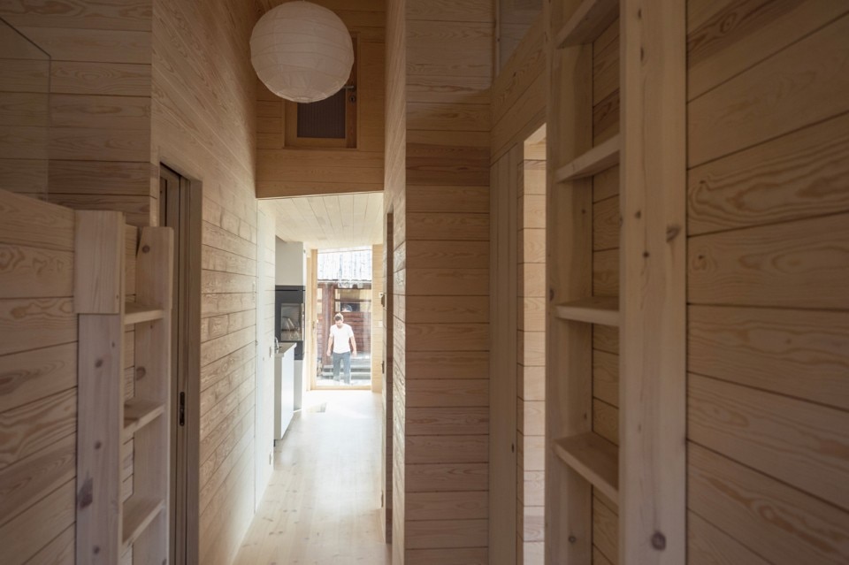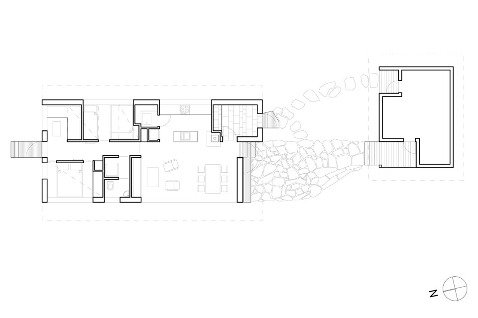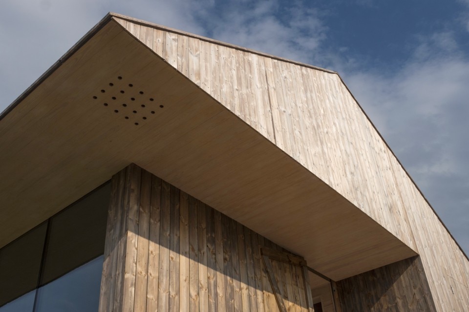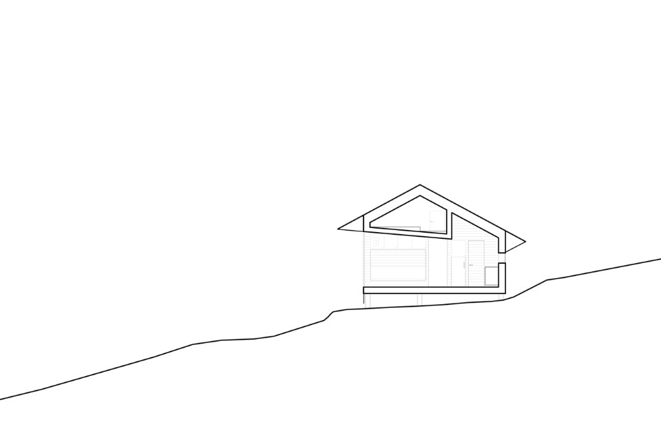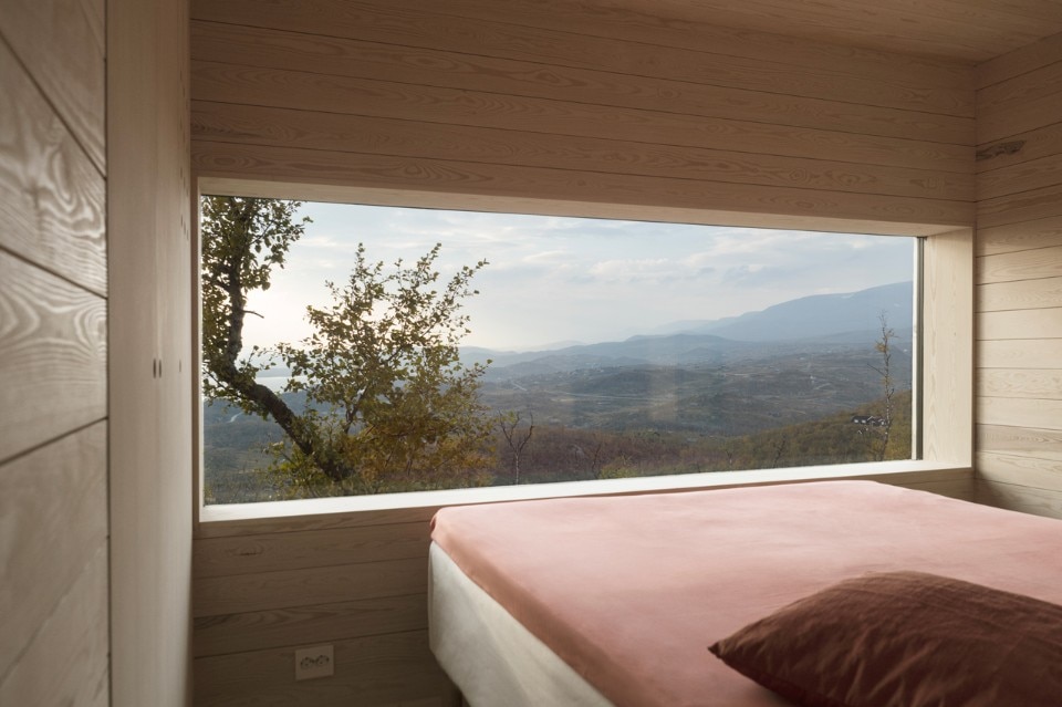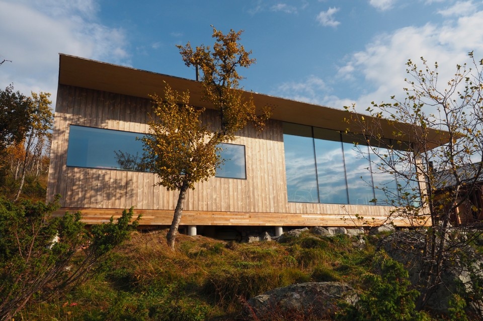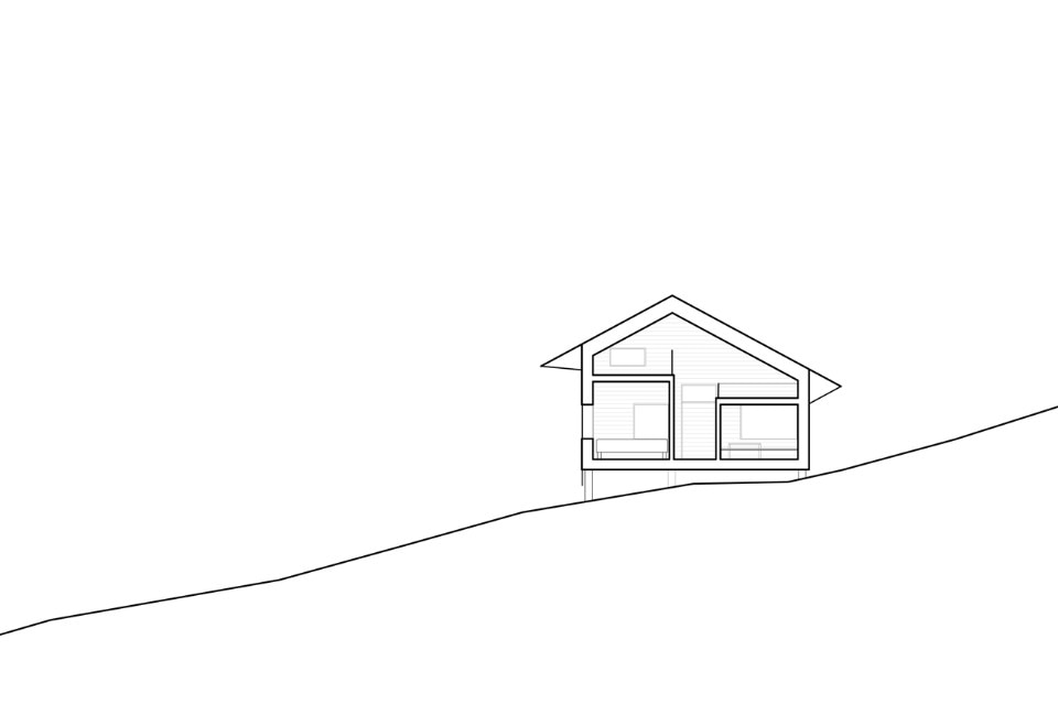 The cabin is clad in pine, inside and out. Three-layer, insulating and solar protected glass panels take in the view of a lake, a mountain formation and a glacier all in the same panorama. With this view in mind, the idea for the main room was to create the experience of being outside – exposed to the shifting scenery. To achieve this, the entire view-facing wall is made of glass. The ceiling is angled, attempting to “explode” the room even more. The tilted ceiling, in combination with the “open” wall, alludes to the gapahuk, a Norwegian ur-type of improvised shelter used when hiking.