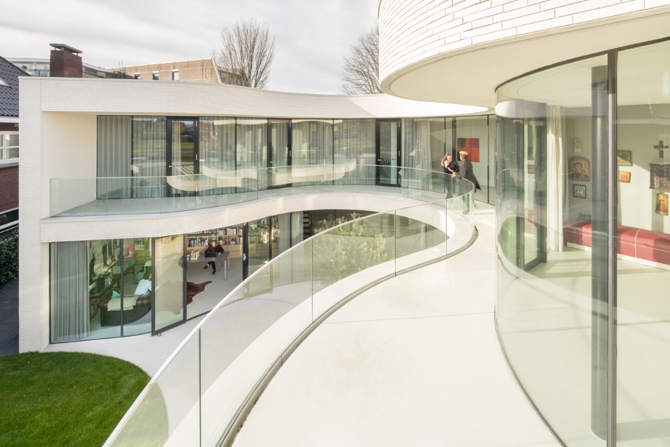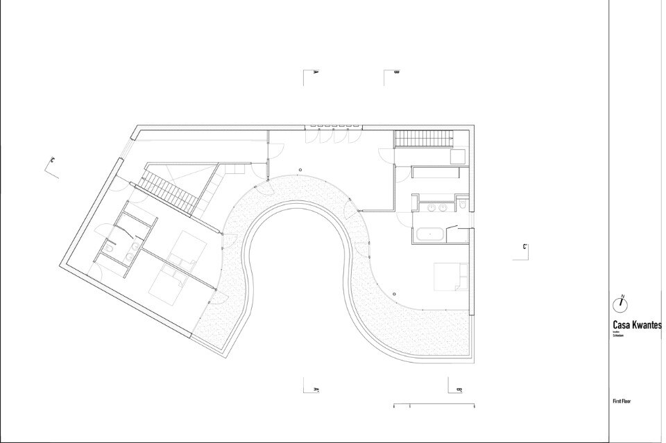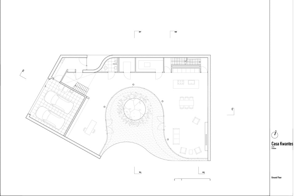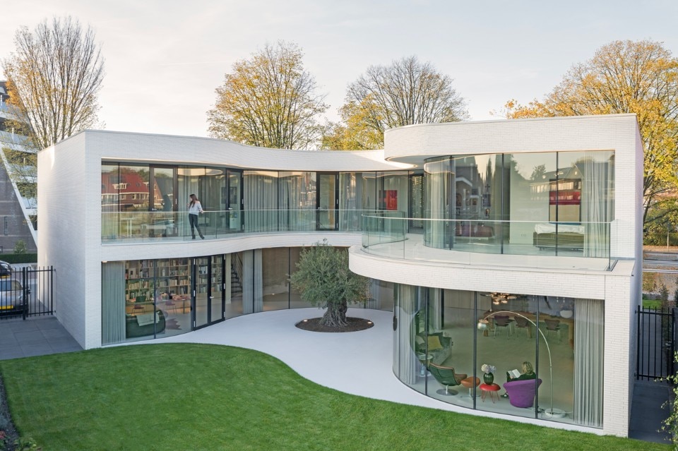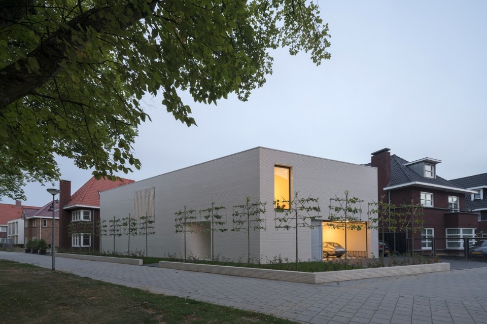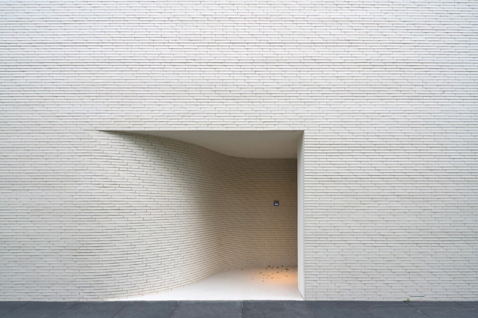 In entering through a curved indent in an otherwise flat and mysterious facade with Celosia brickwork detail, visitors are led into the entrance hall. Stepping into the property, it suddenly opens into the well-lit living spaces of its curved and fluid interior. This continuous wall also serves as an entrance to the garage and staircase.