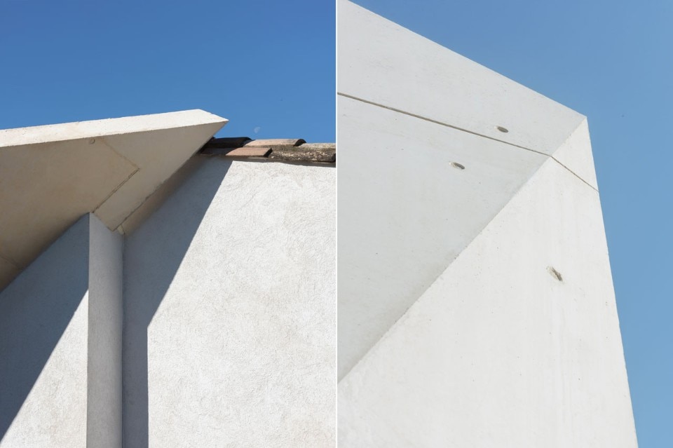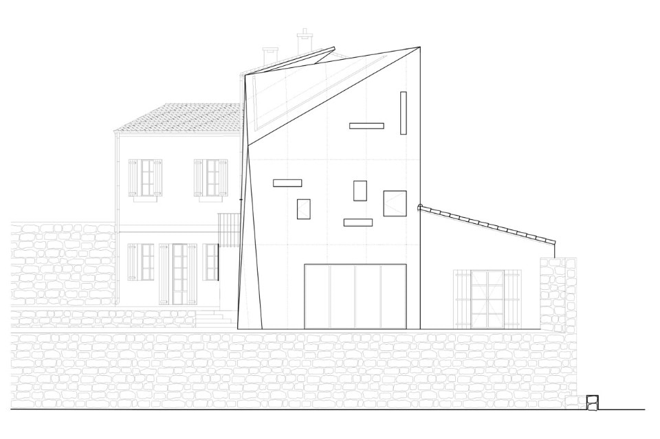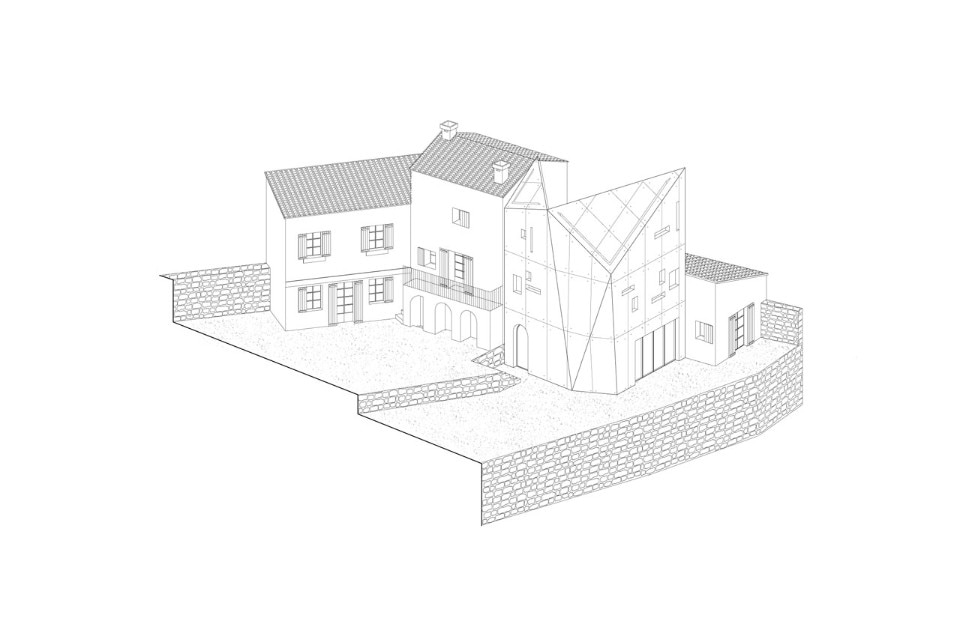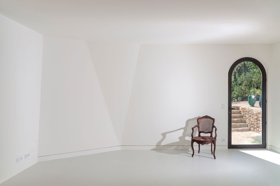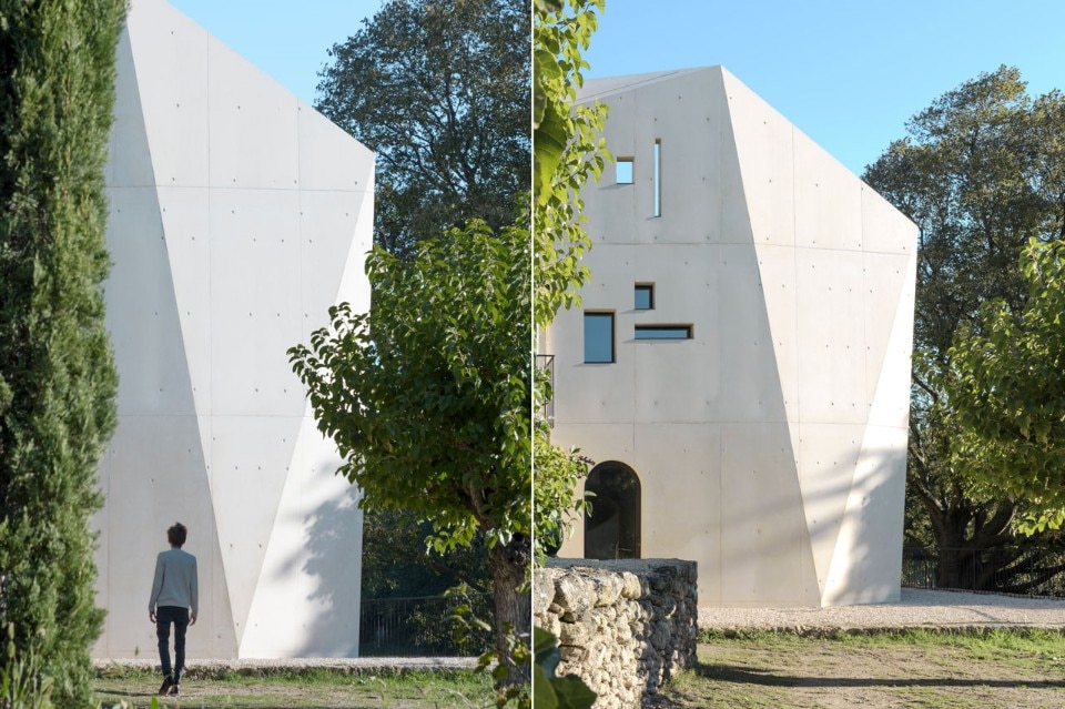 A monolithic and sculptural concrete volume rises from this landscape of greenery and limestone, resonating with the genie of this place, a former quarry. This volume has been designed to allow the interplay of light and shadow to reveal its facetted form and to assert its presence and contemporary look without negating its kinship with the house it adjoins. Narrow openings similar to the farmhouses of the Usège region, are positioned on the east and south facades to protect the interior from intense heat in summer and cold in winter.