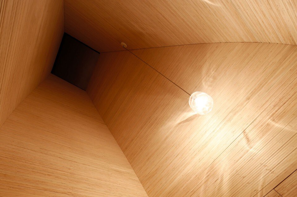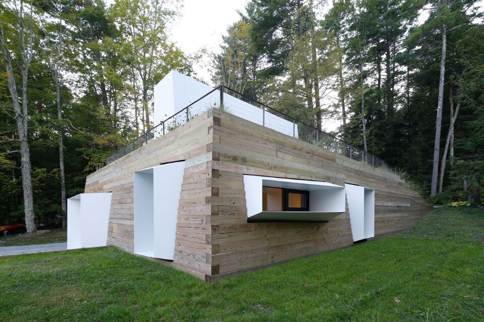 A singular stacked timber wall, serving as both retaining wall for the landscape in which the home is embedded and as a primary enclosure for the home, becomes punctured intensely as the home turns towards the lake. A series of sleeves act as spatial leaks, breaking through the timber and allowing the interior spaces to reach out to the lake in the form of very specific views.