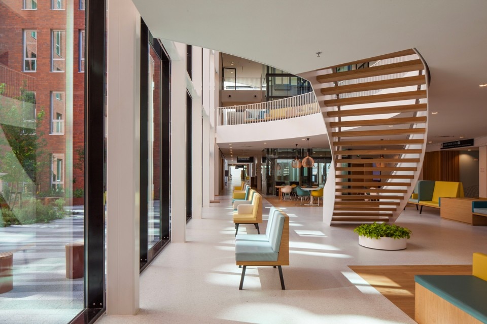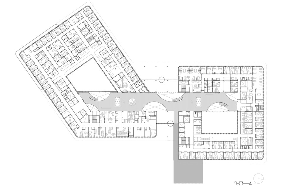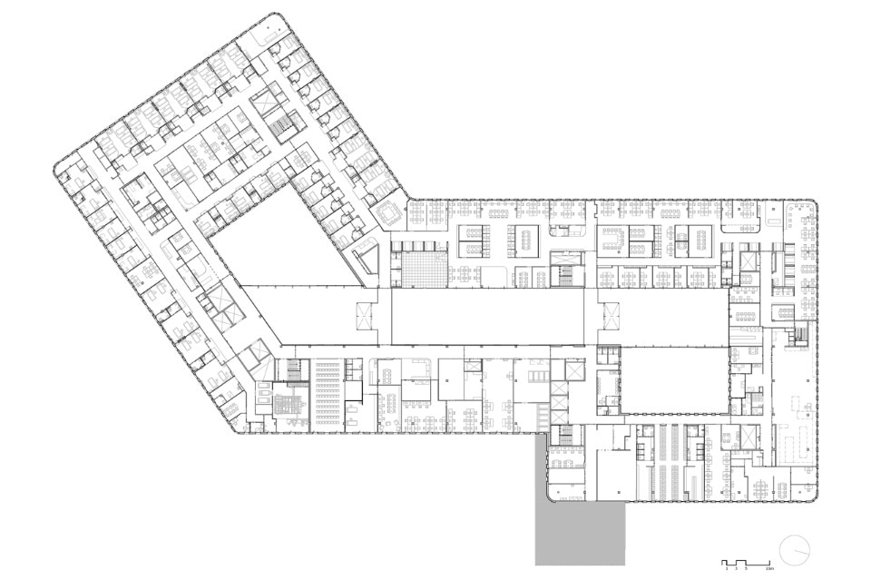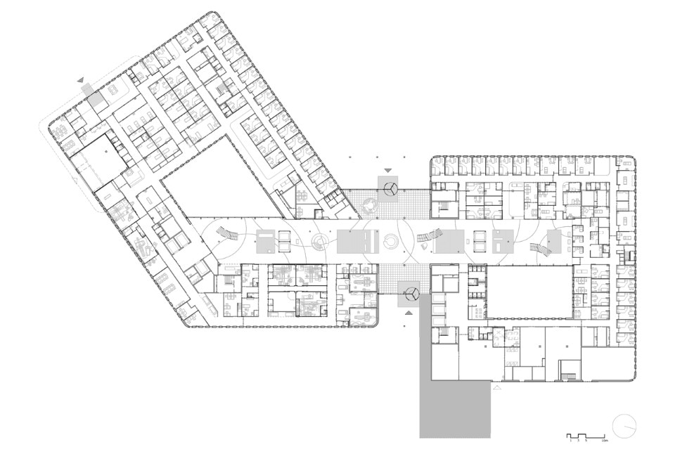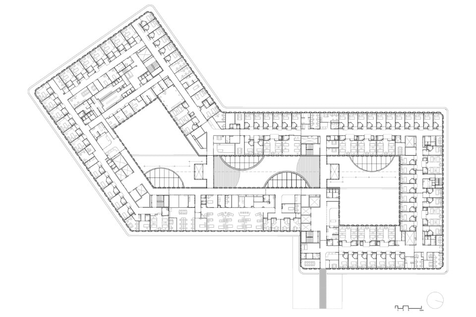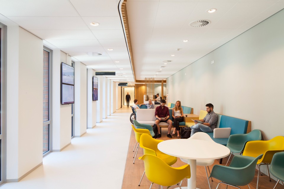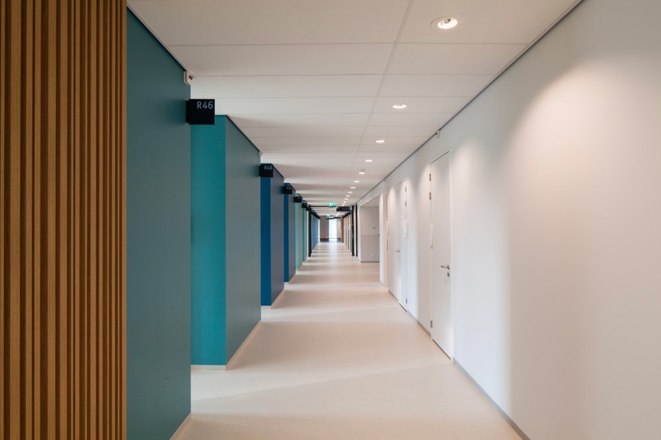 The smart lean design identifies five care processes: acute, elective, outpatient, clinic, and diagnostics. The clear stacking of two floors of outpatient clinics, two floors of clinical departments and a flexible facility layer between them, optimally serves these primary care processes. All departments are designed to prevent any form of waste. Whenever possible, the outpatient clinics and nursing departments are standardised, allowing for exchangeability and adaptability. The Zaans Medical Centre is therefore flexible and future-proof.