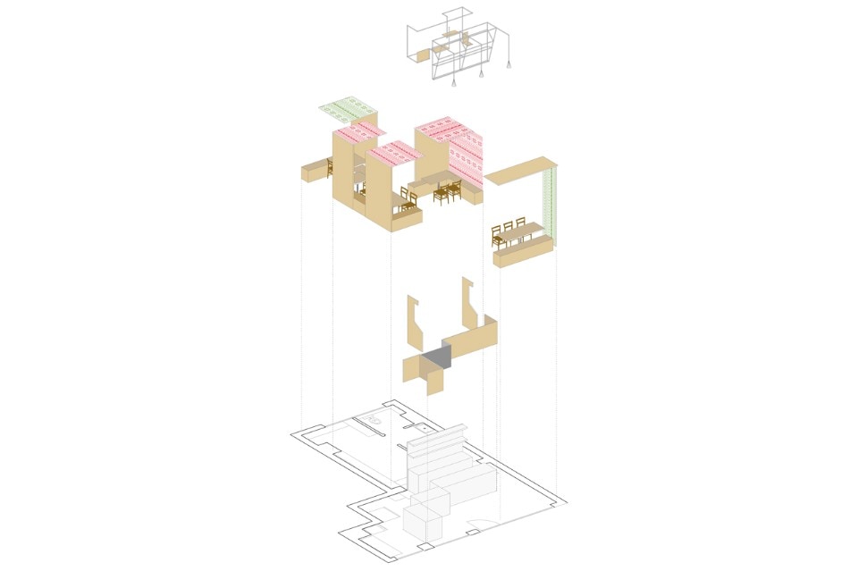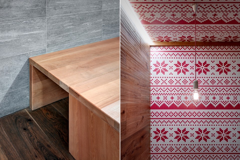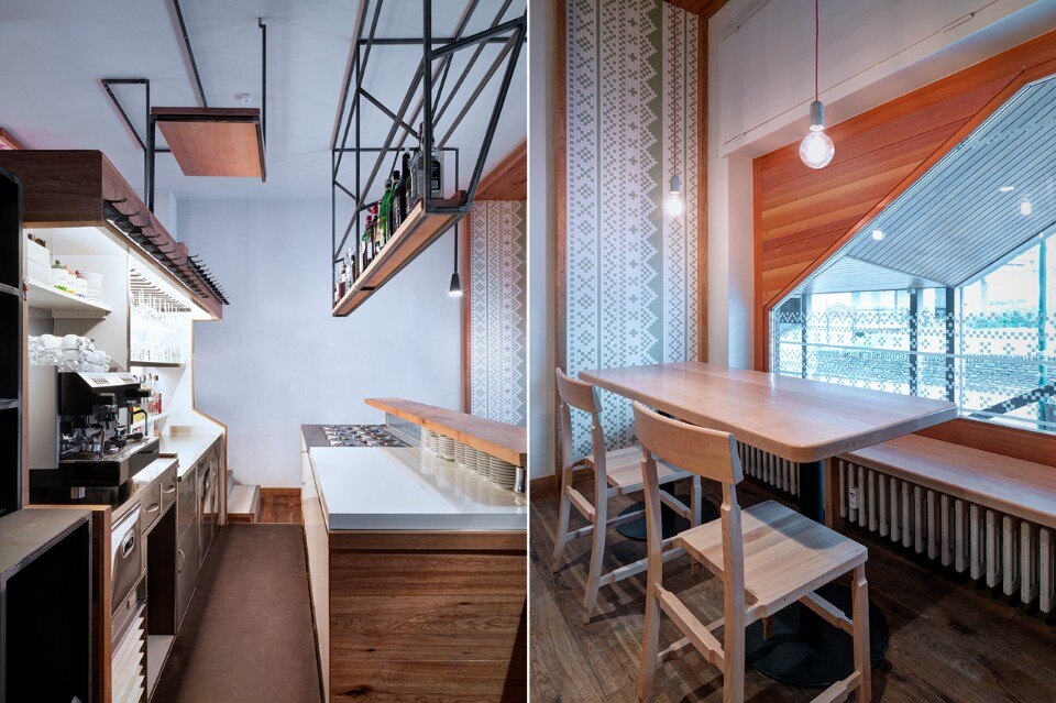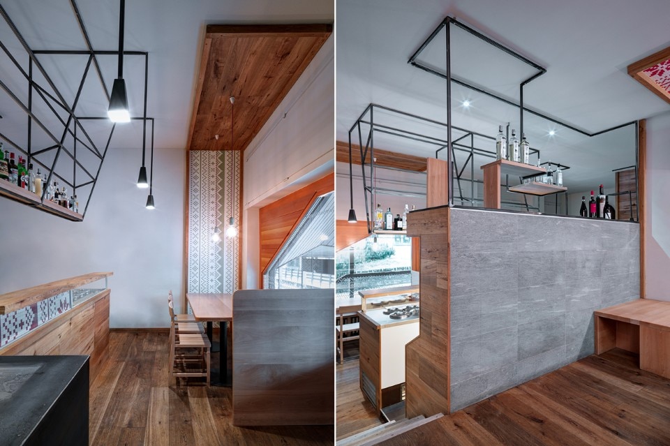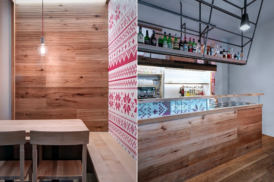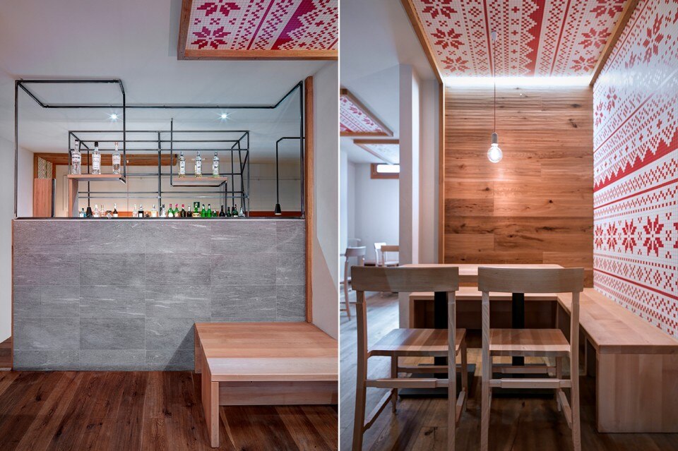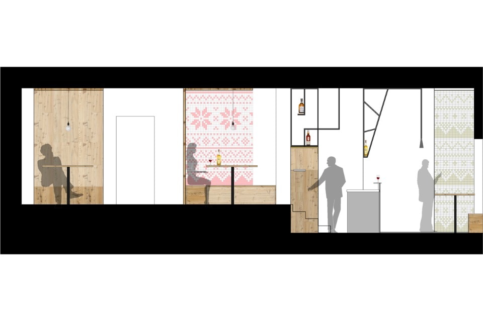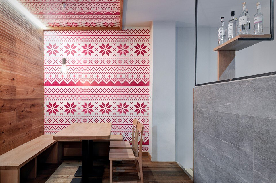 The durmast floor becomes a common element, it crosses the boundaries of horizontal geometries and ventures on vertical walls and wraps the existing counters. At each table there is a portion of wooden wall. The aim is to atomize the small space; As if a micro-environment was created around each table. To do so, a portion of wall or ceiling covered in wallpaper will be associated with the wooden wall. Paper models for making Norwegian sweaters turn into decoration. The aim is to create a positive mental association in the users of the small bistrot, through childlike memories of the mountain. The size of the benches goes beyond that of the tables; they stretch and widen with different seating arrangements. Finally, to highlight the intimacy of each tile that makes up this small puzzle of 45 square meters, each table has a suspended lamp.