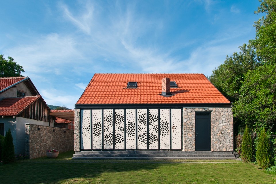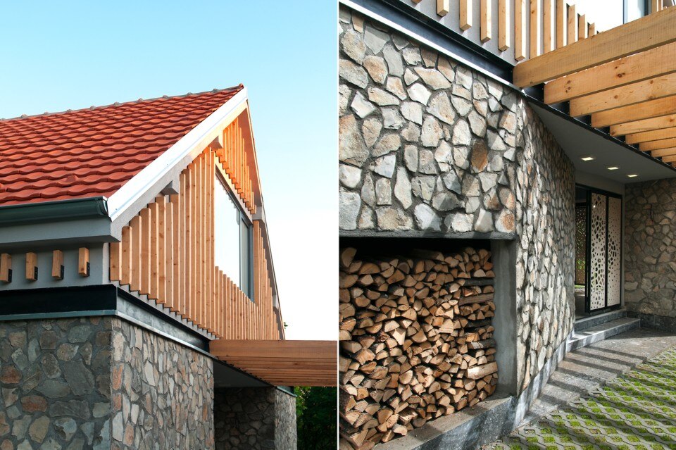 Functionally, the house is divided into ground floor (containing living room, kitchen with dining room, and terrace), and loft (with three bedrooms and bathroom). The access to the house is on the northern side, while the southern side of the existing house is extended with a terrace, which is an inter-space between the interior and the backyard. Extended parts of the ground level are cladded with stone tiles from local quarry. The upper level is partly covered with wooden planks, making an interaction with gables on surrounding houses, which are usually covered with wood.