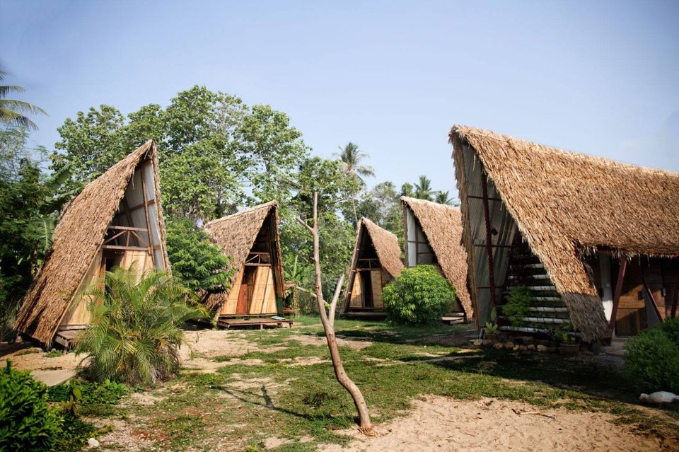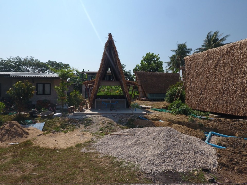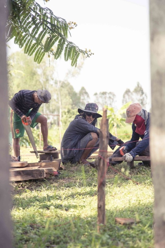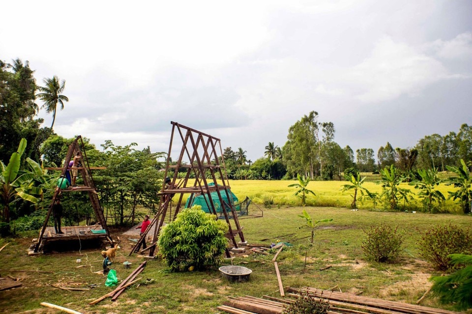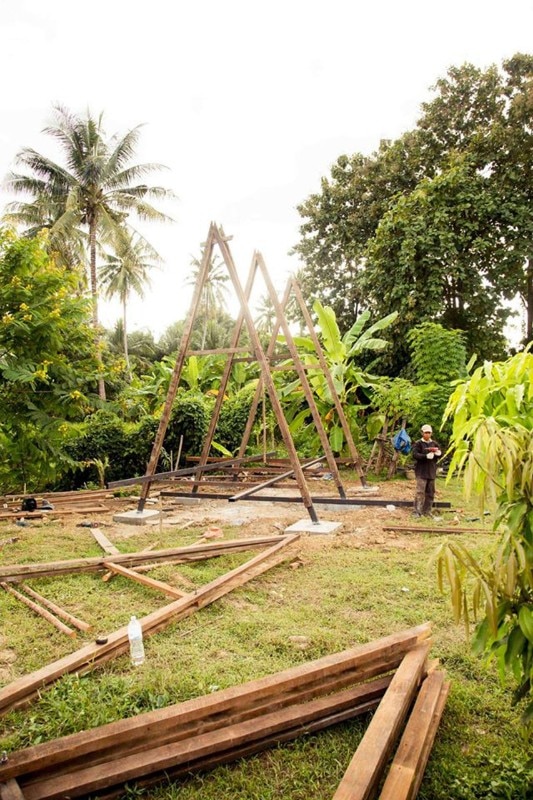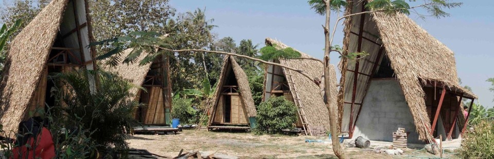 The shelter were constructed with recycled wood from the demolition of old houses in Thailand, in order to find alternative solutions to the rising deforestation in Southeast Asia. The roof design takes elements of the local construction found in the area, maximizing the use of locally available materials. The roof of the houses and the bathroom are composed of a first inner layer of aluzinc, screwed to the rain-proof wood structure, a second intermediate layer of eucalyptus logs installed vertically to create ventilation, and an outer layer of leaves sugar cane extracted from a crop near the project lot.
