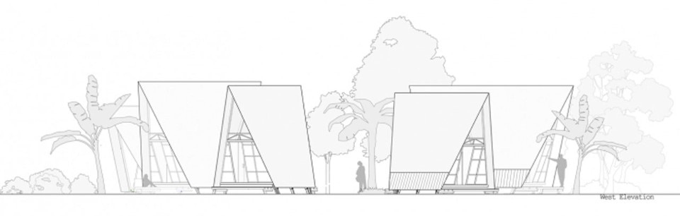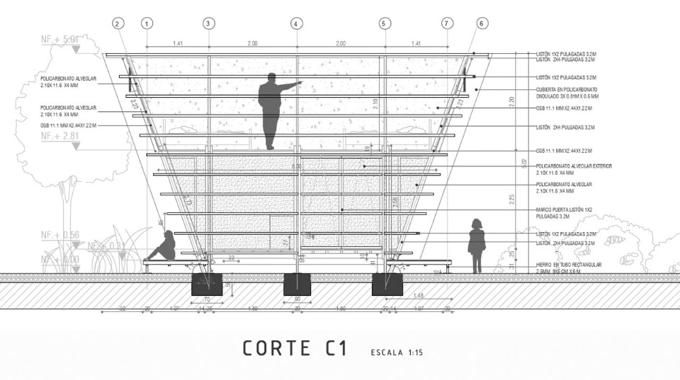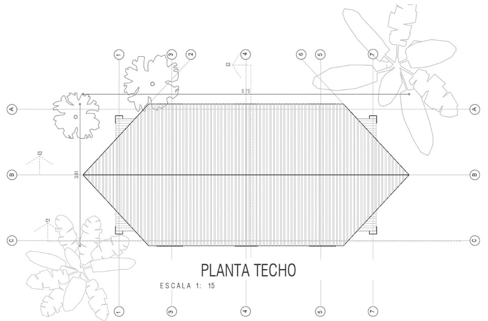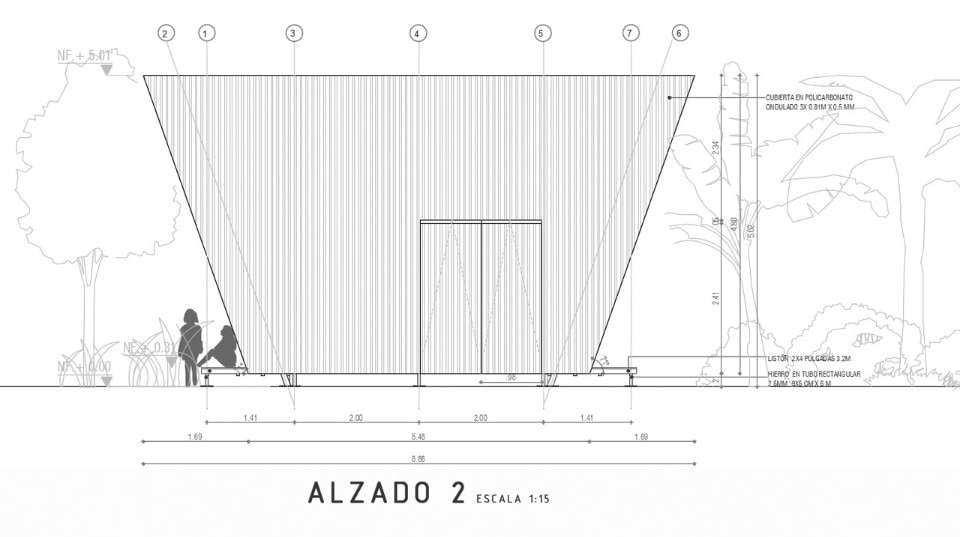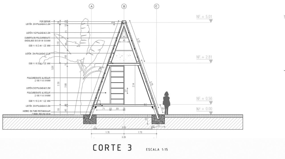 To assemble each housing module requires three trusses that act as a skeleton and which support the weight of the roof and divide the interior space into four parts: two social areas on the first floor and two private on the second level. To this two inclined trusses are added on each triangular side of the house, which helps to protect from heavy rains. In parallel there is a bathroom unit with steel profiles and concrete block walls to delineate the four small interior spaces.