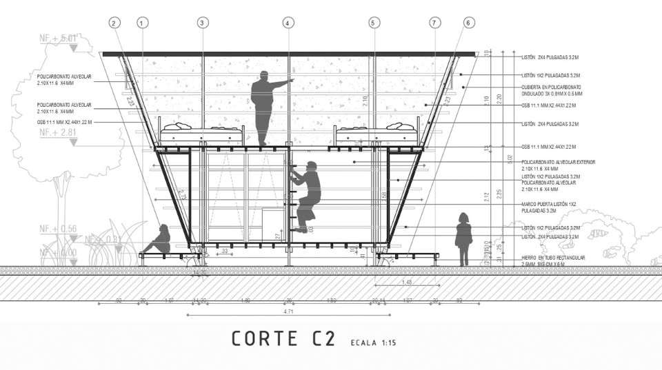 Working directly with the offices of architects Estudio Cavernas and Agora Architects, located in Thailand, Contreras adapted the original design this time to a displaced inhabitant of his country, minor, and without family. The idea was to create a community by grouping a series of housing shelters. The structure allows for two children to live in, each with its bedroom on the upper level and its own social area on the first level.