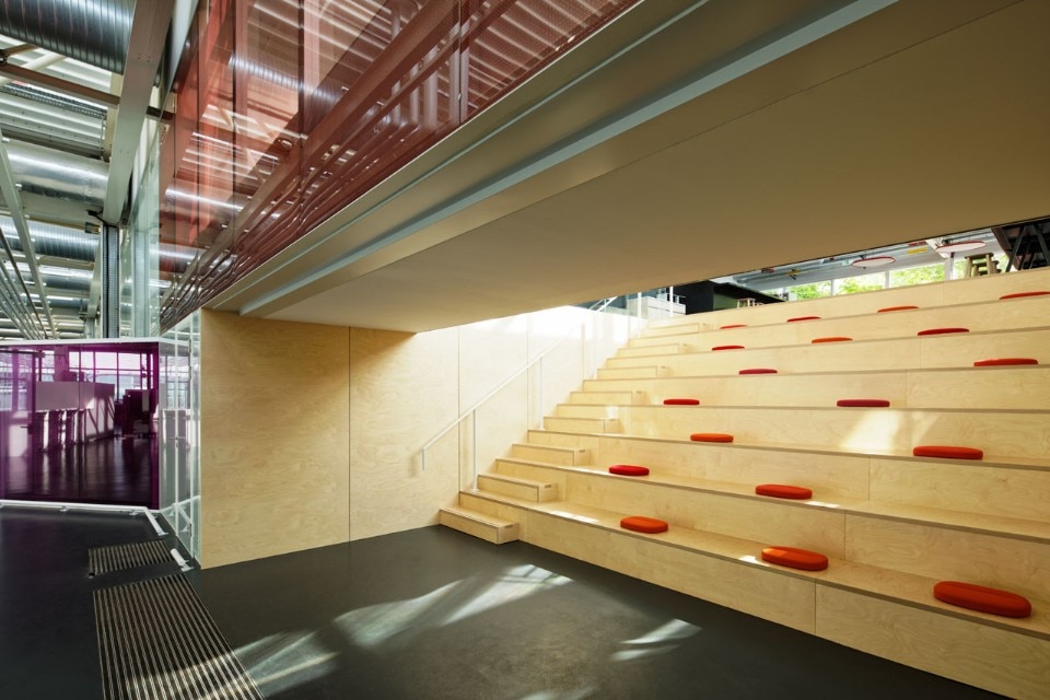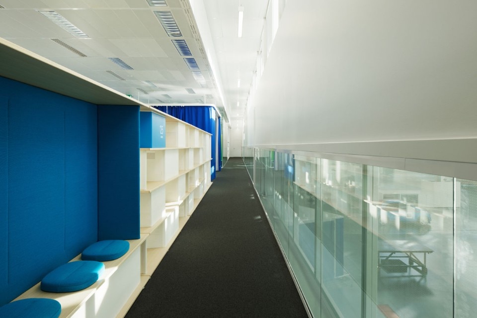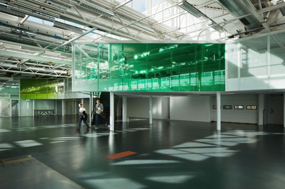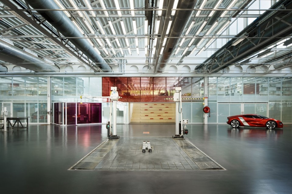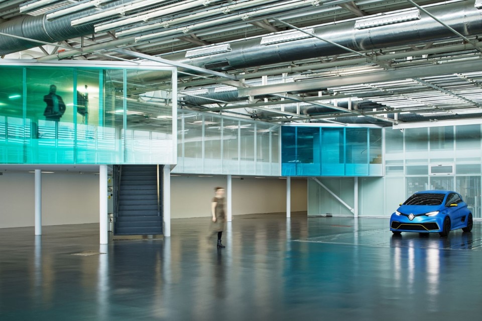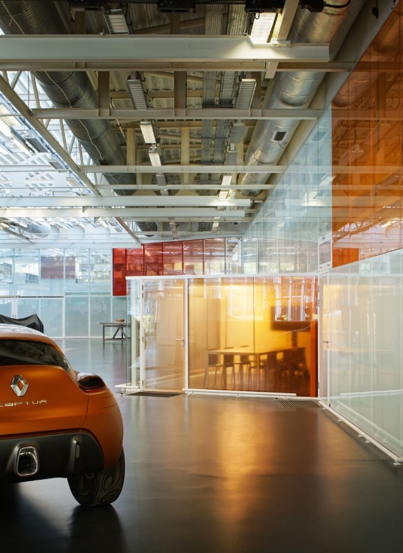 By contrast the firm’s strategy at Guyancourt focuses on the interior. There is nothing coy about the way they show off the great workshop at the heart of the complex. Here the carmaker’s prototype models wait for stylists to add the finishing touches. Now the workshop has become visible in the round, thanks to the rationalisation of the routes through the building and sightlines in the interiors, differentiated only by a few acid colours applied to the frosted glass doors (five colours matching the Renault Group’s five marques).