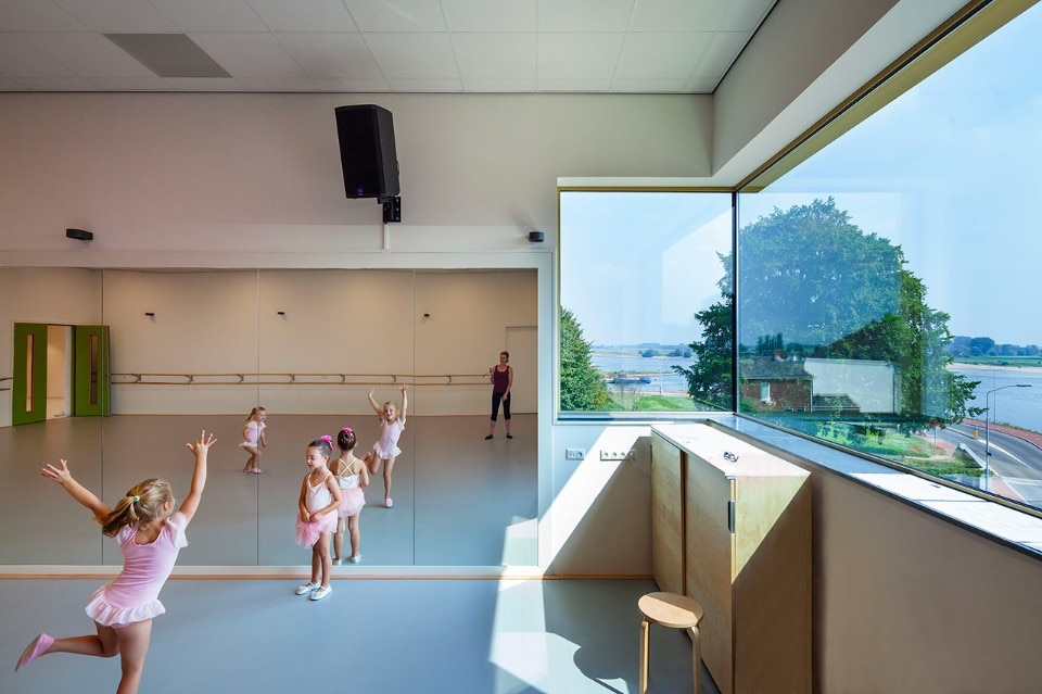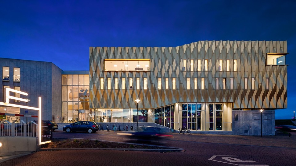 The remarkable facade of Zinder Education comprises faceted aluminium elements, anodised with a golden colour. Together, the folded panels form an origami pattern presenting a constantly varying image to the inhabitants of Tiel, depending on the perspective, weather conditions and time of day. The large windows provide a view of what is happening in the building. From the street you catch a glimpse of the dancers rehearsing, see sculpture students at work, and your attention is drawn to a concert in the multi-functional hall.