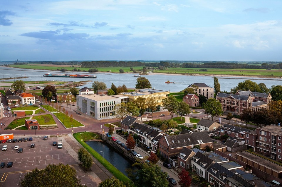 Tiel’s new culture building by De Zwarte Hond, Zinder, is situated between the city centre and the river Waal. The new culture cluster pulsates and stimulates and invites the inhabitants of Tiel and the surrounding area to participate. The project is very meticulously embedded between the river, the historic city centre and the formal Rechtbankstraat. What carries the plan is the raised culture podium: a new plaza with the volumes of the arts centre (Zinder Education) and the public library. The podium exploits the differences in height of the venue, transforming it into an attractive recreational area that will function as an extension to the culture building – blurring the boundaries between inside and outside.