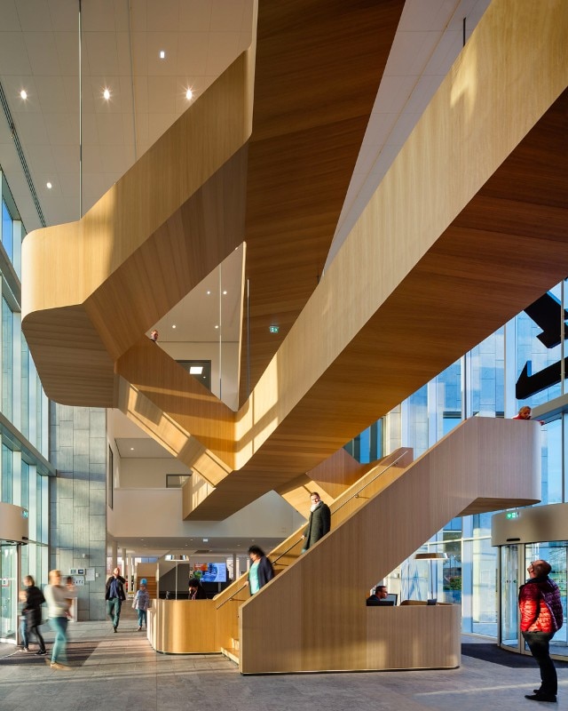 Zinder Education, the centre for the arts, is housed in the “golden lantern” which floats as it were above the culture podium. Next to it, there is a robust, natural stone volume where the library is located. While Zinder Education is a prominent landmark in Tiel, the library seeks more connection with the historic city centre. The central entrance hall forms the link between the two volumes. Here visitors meet and inspire each other. The multi-functional hall that lies sunken beneath the lantern accommodates 320 people.